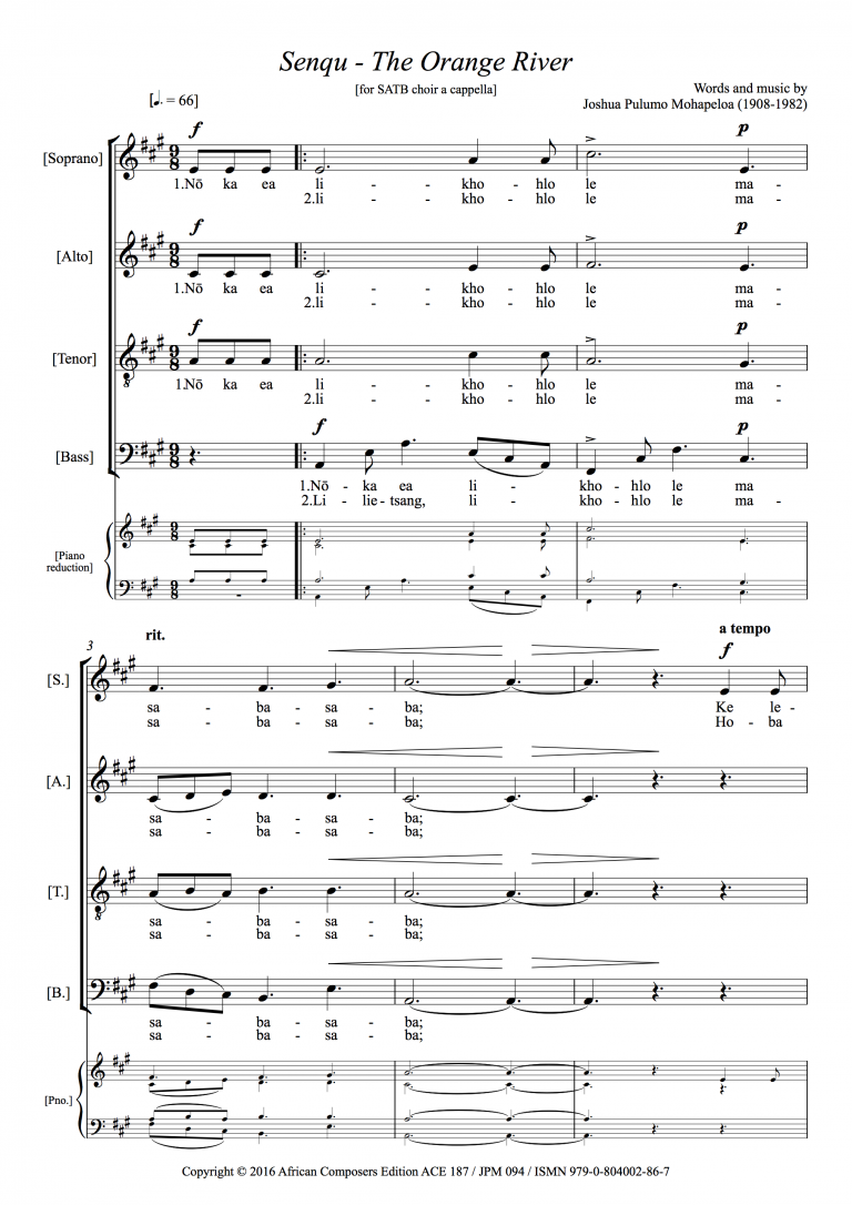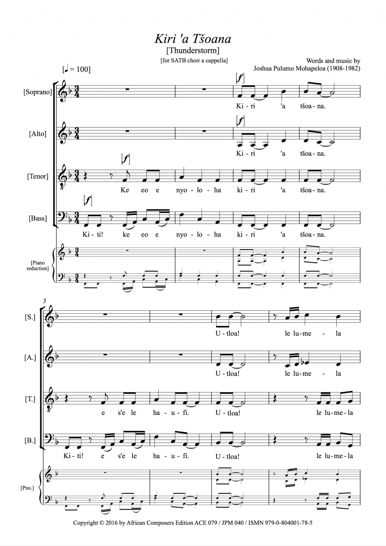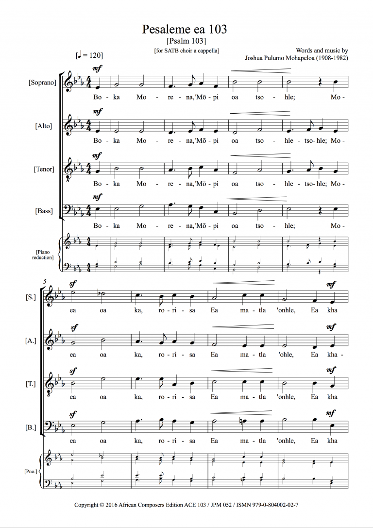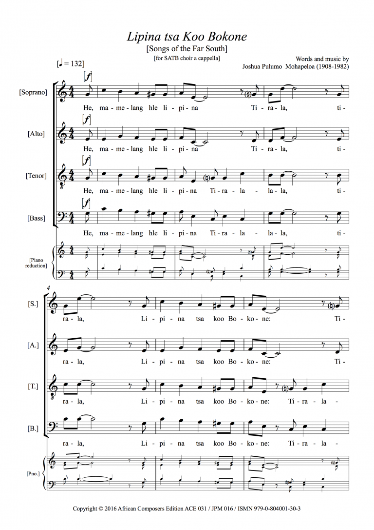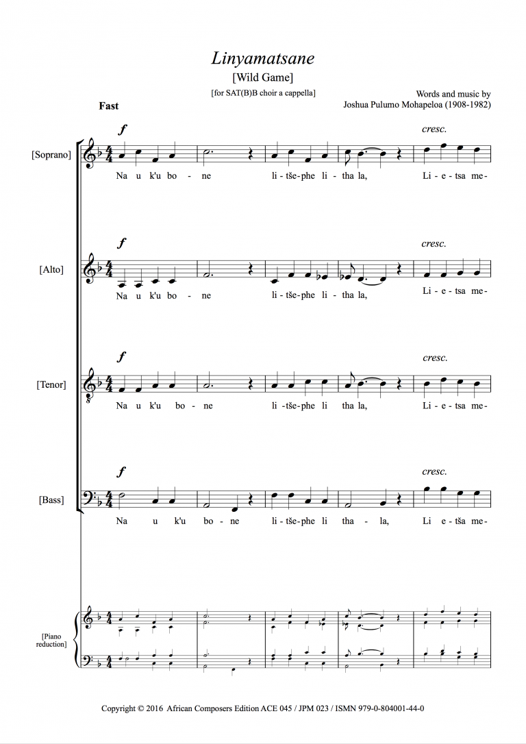 ACE published 145 extant works by Lesotho composer Joshua Pulumo Mohapeloa (1908-1982) between 2013 and 2016 individually, in six volumes and in a complete scholarly edition. All but one are choral works and they are presented in both dual staff-solfa notation and staff notation only. ACE has also published 31 historic recordings of choirs performing Mohapeloa’s music.