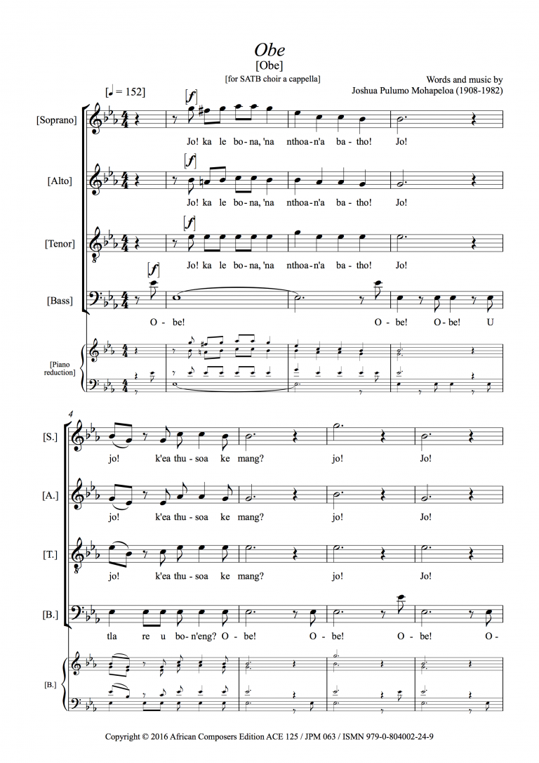 ACE published 145 extant works by Lesotho composer Joshua Pulumo Mohapeloa (1908-1982) between 2013 and 2016 individually, in six volumes and in a complete scholarly edition. All but one are choral works and they are presented in both dual staff-solfa notation and staff notation only. ACE has also published 31 historic recordings of choirs performing Mohapeloa’s music.