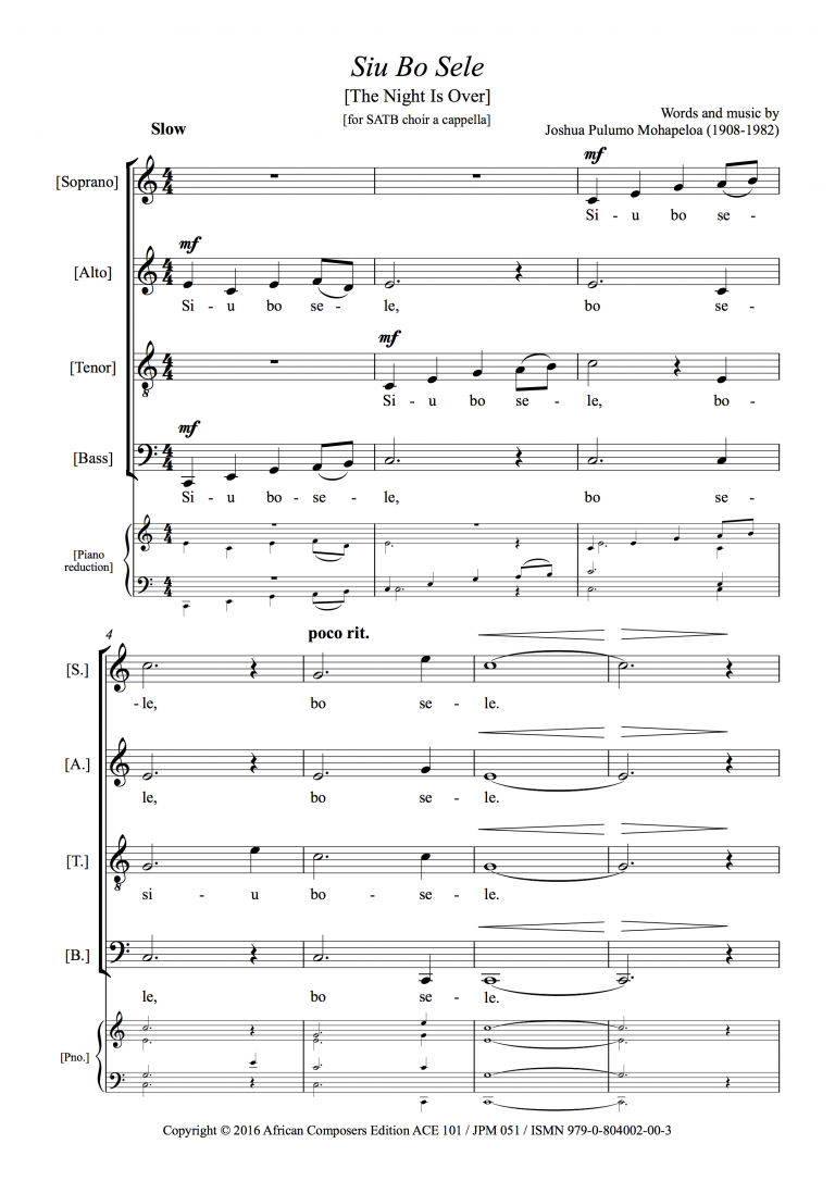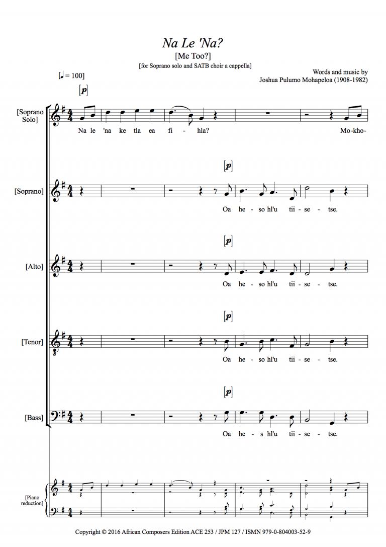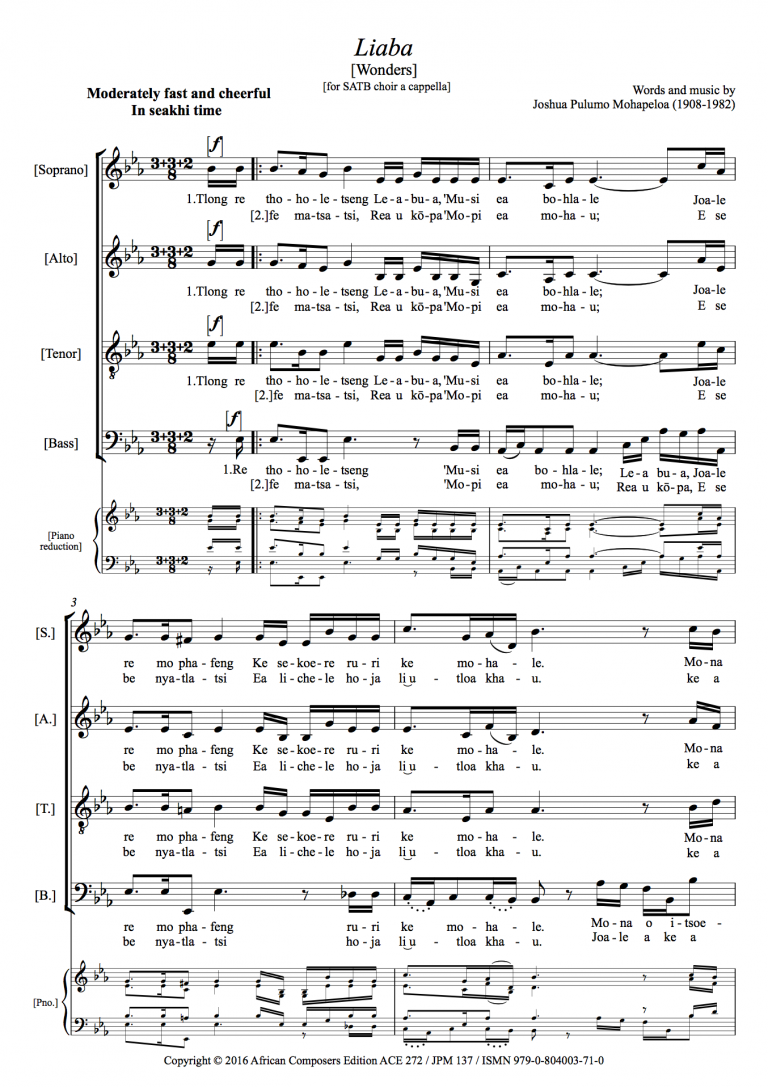 ACE published 145 extant works by Lesotho composer Joshua Pulumo Mohapeloa (1908-1982) between 2013 and 2016 individually, in six volumes and in a complete scholarly edition. All but one are choral works and they are presented in both dual staff-solfa notation and staff notation only. ACE has also published 31 historic recordings of choirs performing Mohapeloa’s music.