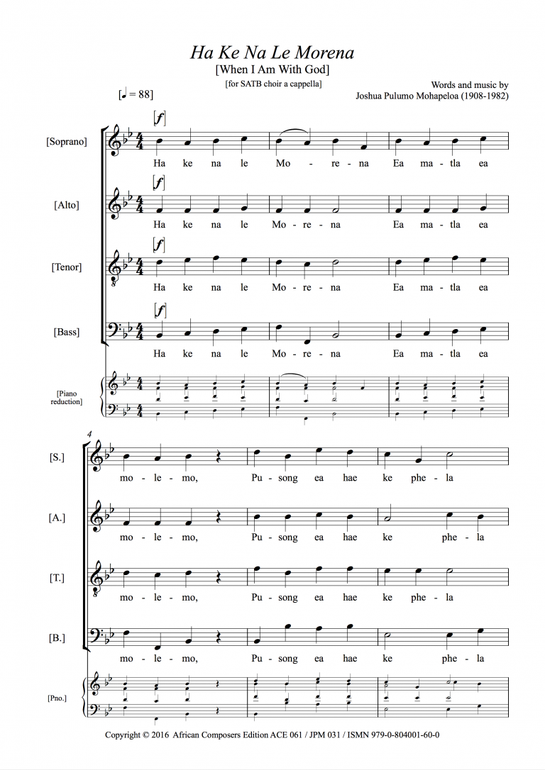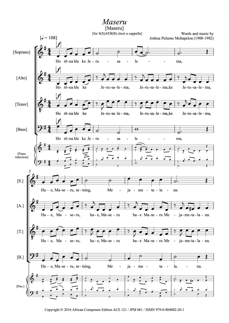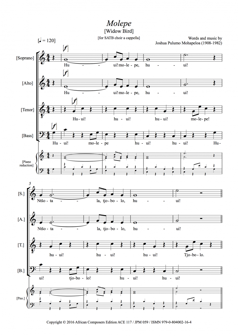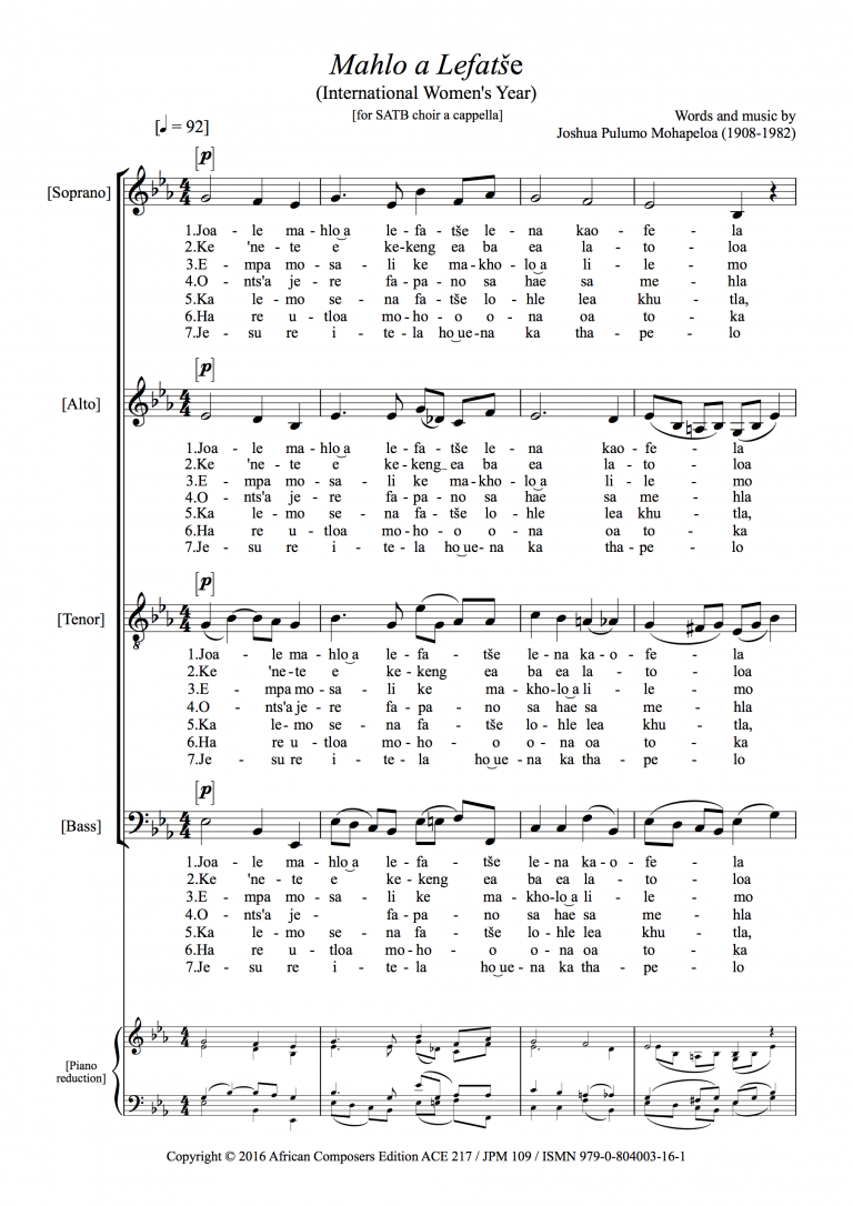 ACE published 145 extant works by Lesotho composer Joshua Pulumo Mohapeloa (1908-1982) between 2013 and 2016 individually, in six volumes and in a complete scholarly edition. All but one are choral works and they are presented in both dual staff-solfa notation and staff notation only. ACE has also published 31 historic recordings of choirs performing Mohapeloa’s music.
