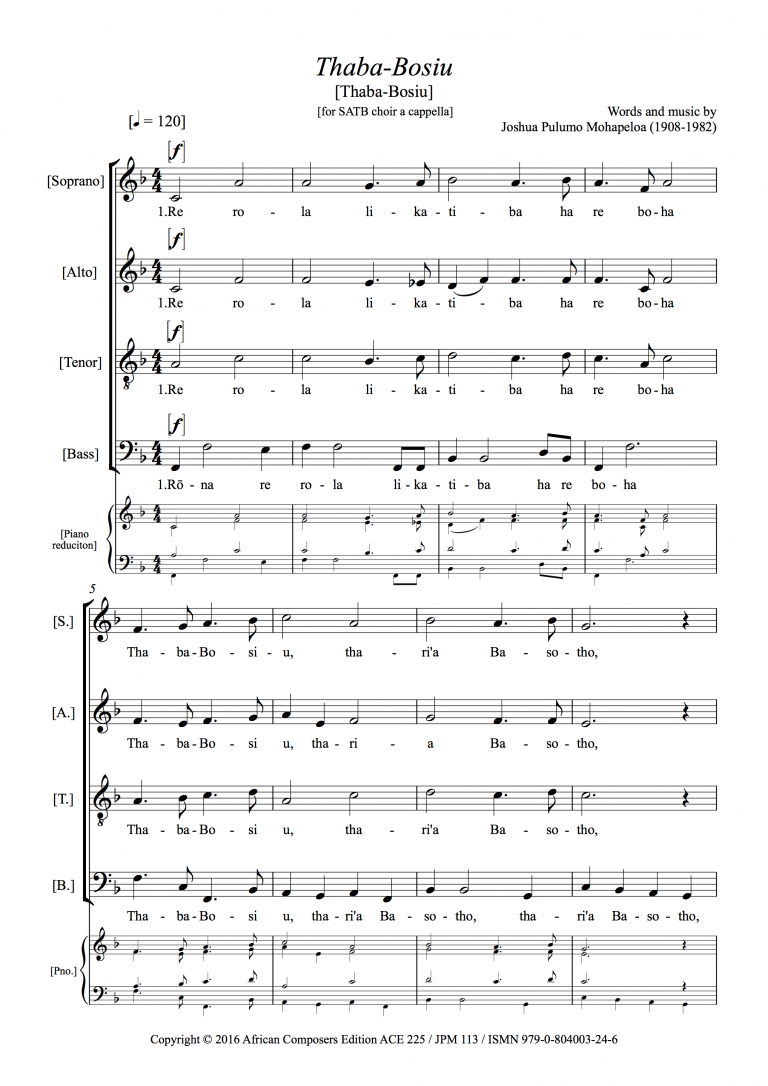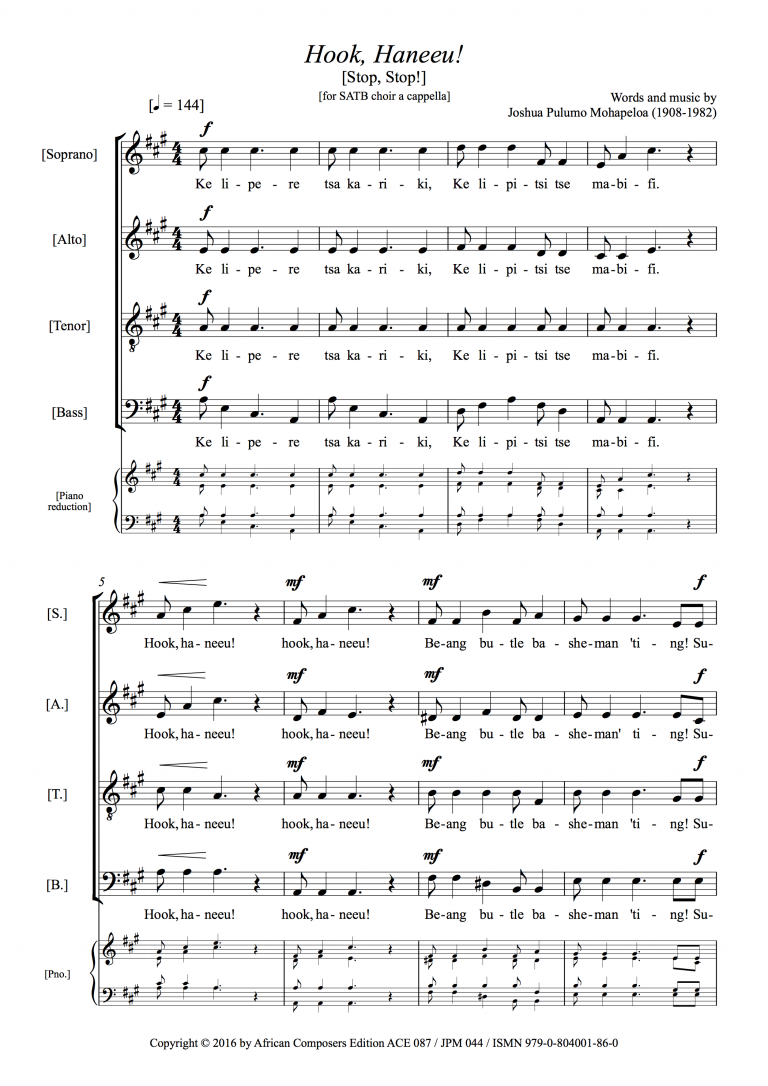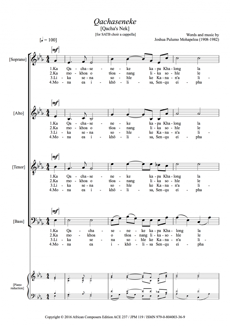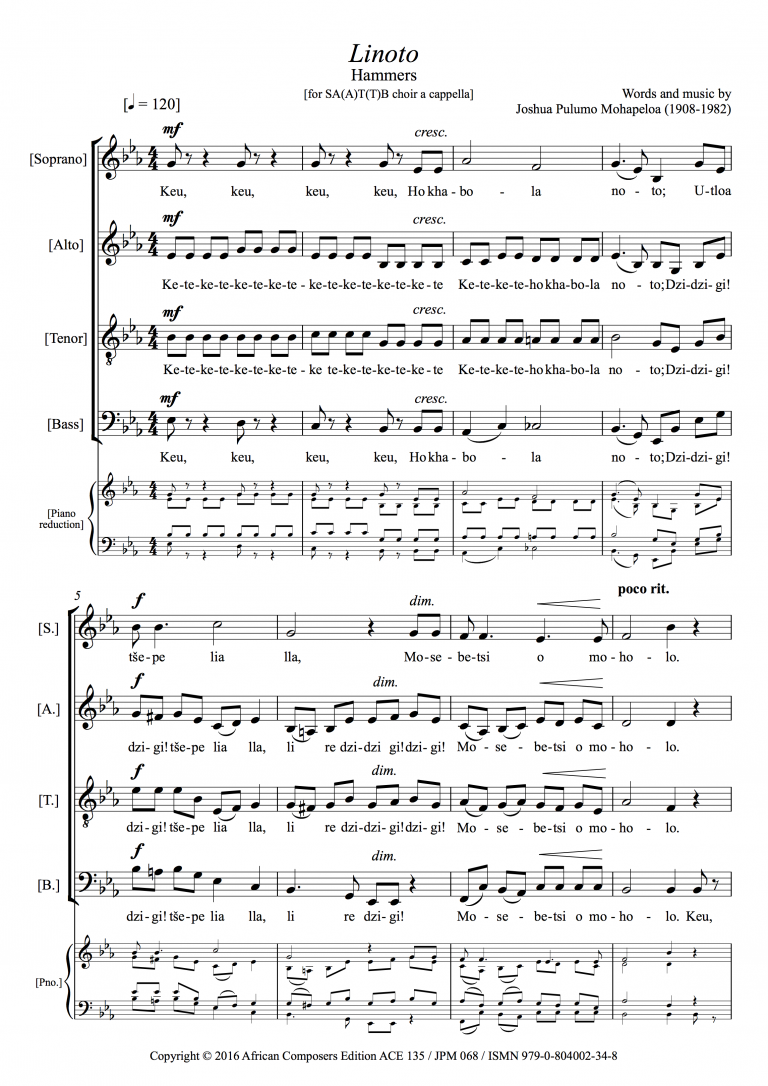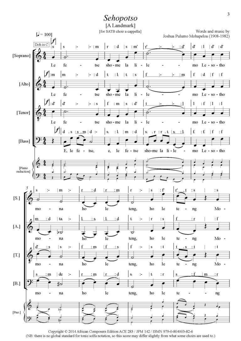 ACE published 145 extant works by Lesotho composer Joshua Pulumo Mohapeloa (1908-1982) between 2013 and 2016 individually, in six volumes and in a complete scholarly edition. All but one are choral works and they are presented in both dual staff-solfa notation and staff notation only. ACE has also published 31 historic recordings of choirs performing Mohapeloa’s music.