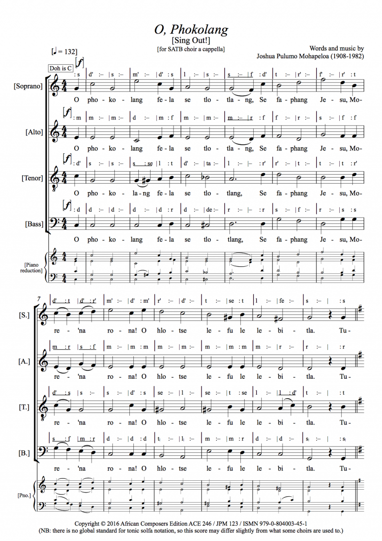 ACE published 145 extant works by Lesotho composer Joshua Pulumo Mohapeloa (1908-1982) between 2013 and 2016 individually, in six volumes and in a complete scholarly edition. All but one are choral works and they are presented in both dual staff-solfa notation and staff notation only. ACE has also published 31 historic recordings of choirs performing Mohapeloa’s music.
