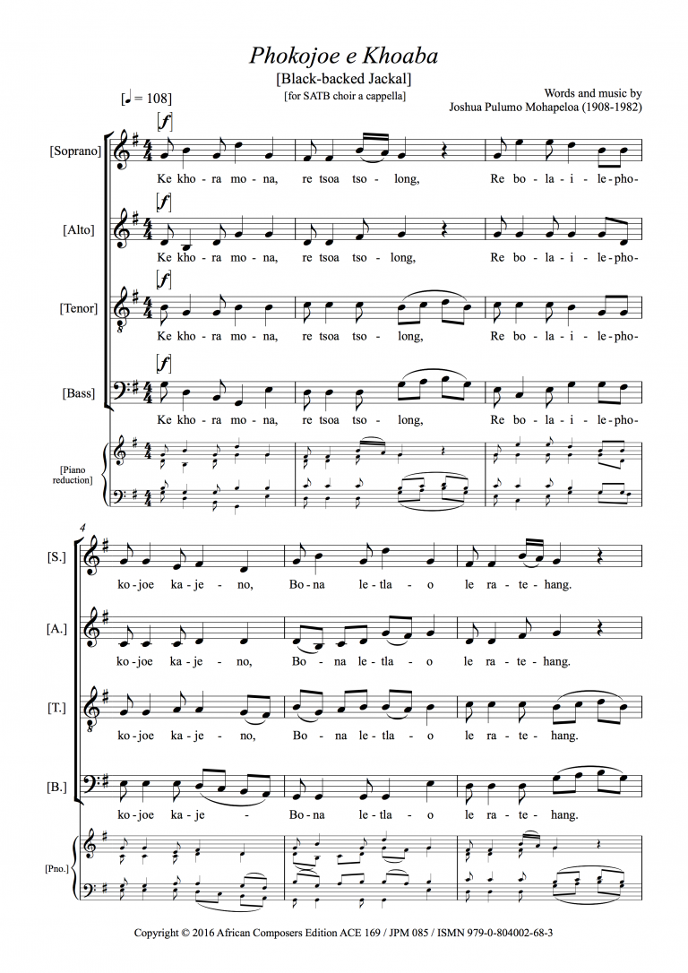 ACE published 145 extant works by Lesotho composer Joshua Pulumo Mohapeloa (1908-1982) between 2013 and 2016 individually, in six volumes and in a complete scholarly edition. All but one are choral works and they are presented in both dual staff-solfa notation and staff notation only. ACE has also published 31 historic recordings of choirs performing Mohapeloa’s music.