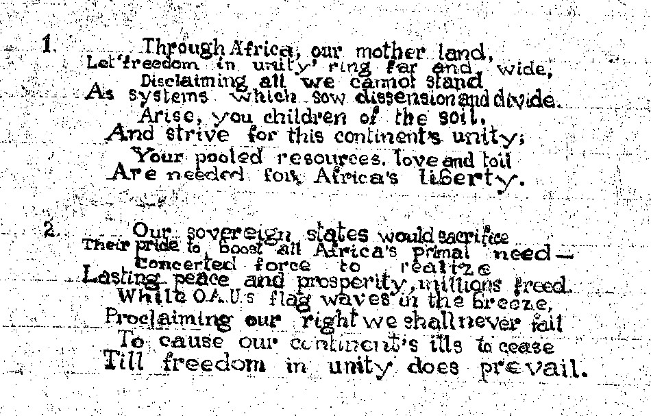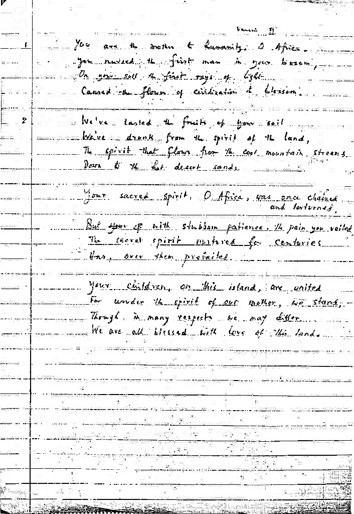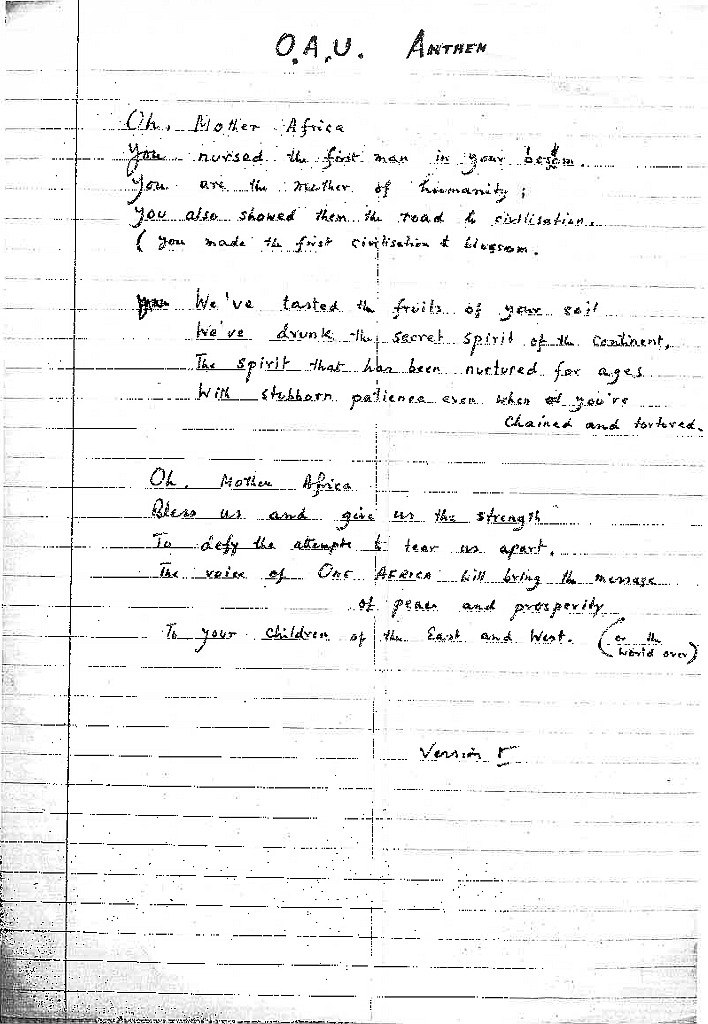 Evidence from two surviving handwritten drafts of other songs suggests that Mohapeloa worked on texts separately from the music – sometimes before, sometimes after, sometimes while composing the music. Freedom in Unity is an unpublished manuscript intended as an anthem for the (then) Organisation of African Unity. It is a rare example that shows how his lyrics evolved. Two drafts of the lyrics of this song, labelled ‘Version I” and ‘Version II’ on the manuscript are shown below, together with the text that he finally settled on.