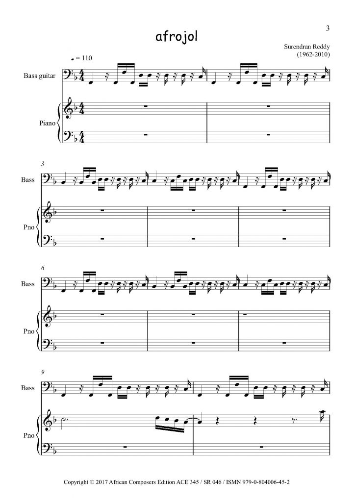 afrojol was originally composed as a jazz tune around 1991 for Channel 18, Reddy’s jazz-fusion band with whom he worked in Johannesburg. This comprised Reddy (keyboards), Rob Watson (drums), Danny Lalouette (bass), and Bruce Cassidy (electronic valve instrument). In Germany, Reddy performed it with Daniel Schlaeger (drums), Stefan Schoenegg (bass), and Martin Heizmann (saxophone). The piece works well as a piano solo, as a piano and bass duet as shown in the video below (where it is played at a rather slow tempo), or as a jazz trio, quartet, etc. Reddy rewrote the piece in 2005, writing out the piano part in full. Reddy was both a classical virtuoso and a jazz pianist, and compositions like afrojol are a fusion between the two styles that he called ‘clazz’.
