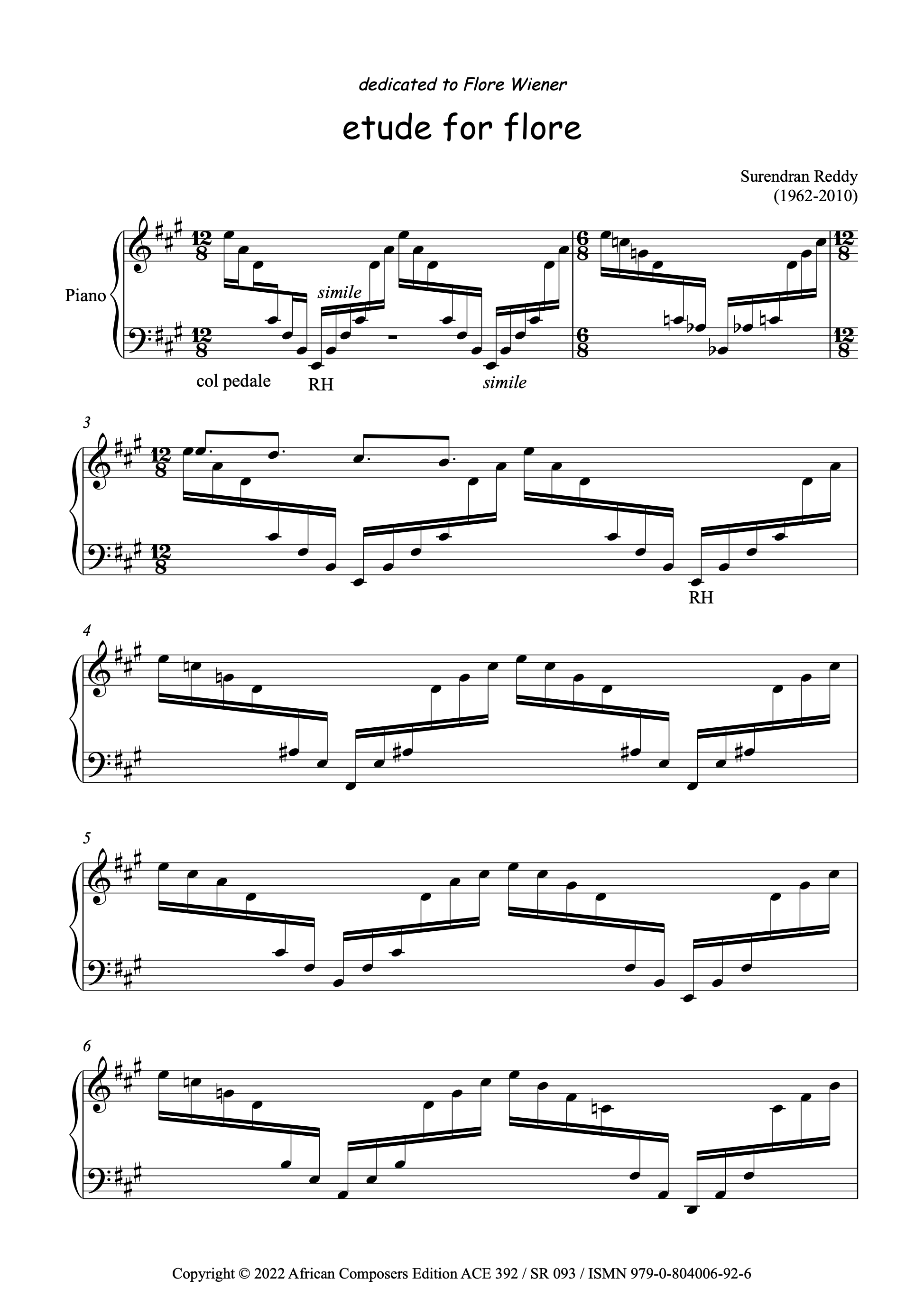 This riotously irreverent work from 2007 is subtitled ‘diabolical variations’, and indeed it is diabolically difficult if not impossible to play. The piece is a set of variations on several themes, including ‘When I Fall in Love’ by Victor Young, the Xhosa folksong ‘Qongqothwane’ (The Click Song), Chopin’s Berceuse op. 57, ‘Cruising Down the River on a Sunday Afternoon’ by Eily Beadell and Nell Tollerton, the Zulu lullaby ‘Thula Baba, Thula Sona’ (Hush Little Man, Hush Baby), and ‘Torna a Sorrento’ (Come Back to Sorrento) by Ernesto de Curtis. After ‘The Click Song’ first appears in C and E-flat, Reddy writes, ‘thru all 12 keys with melodic motive’, a comment that could just as well be interpreted as directions to the performer to improvise as it could be a note to self to compose more. In bar 176, Reddy begins some ‘diabolical variations in the form of a sudoku après chopin’s berceuse’: 14 short variations, each named after a family member or friend. Variation 14 is prefaced, ‘2nd subject + rondo finale’, suggesting that he imagined the overall structure of the berceuse as sonata form morphed with sonata structure as a whole. After this variation comes a short ‘mbaqanga’ (South African township jazz style) section, and after several hundred more bars of virtuoso variations the piece begins to break up. It ends inconclusively, with empty bars. The instructions to the pianist after the last bar read, ‘add when i fall in love in canon at the fourth’.