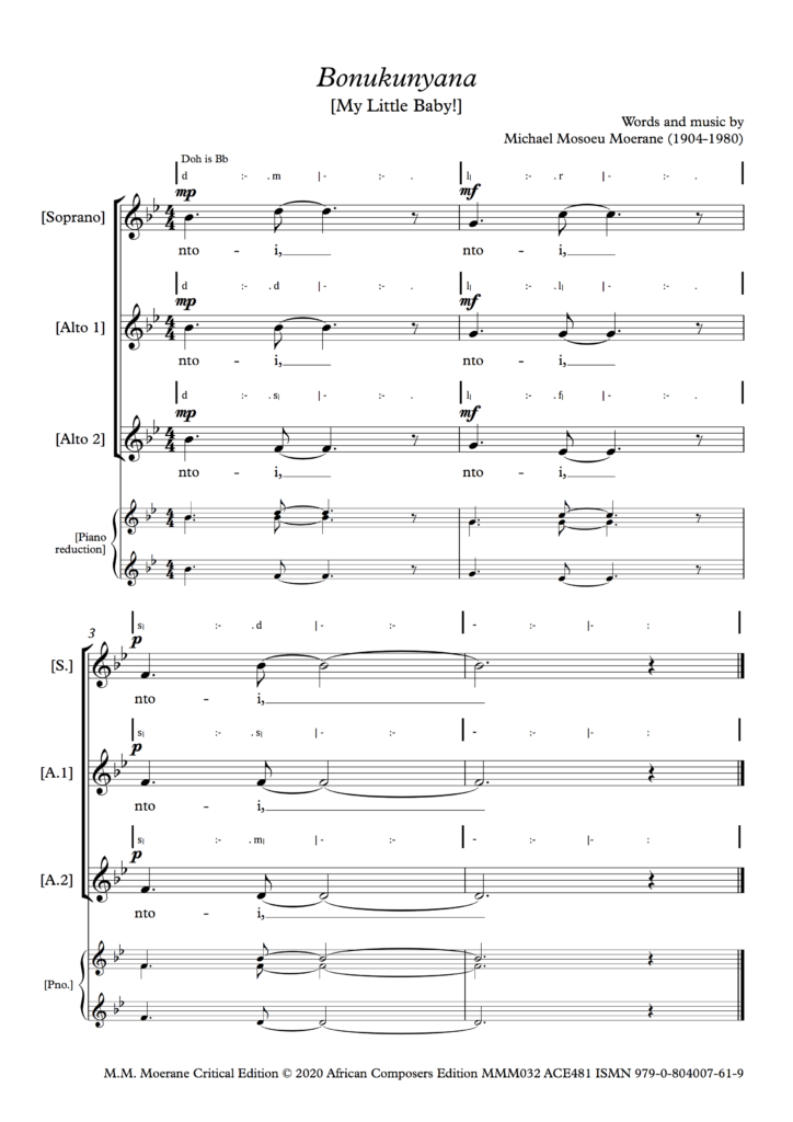 Only the last four bars have survived of a song about ‘bonyukunyana’, which is a pet name for a little girl. One word is repeated: ‘ntoi’, a playful word used in Lesotho culture to encourage a child to eat her porridge. Moerane attributes the text to ‘Setsoto’, a word he often used to describe lyrics that he drew from a traditional source. The featured image on the right shows the whole fragment, and there is no audio file.