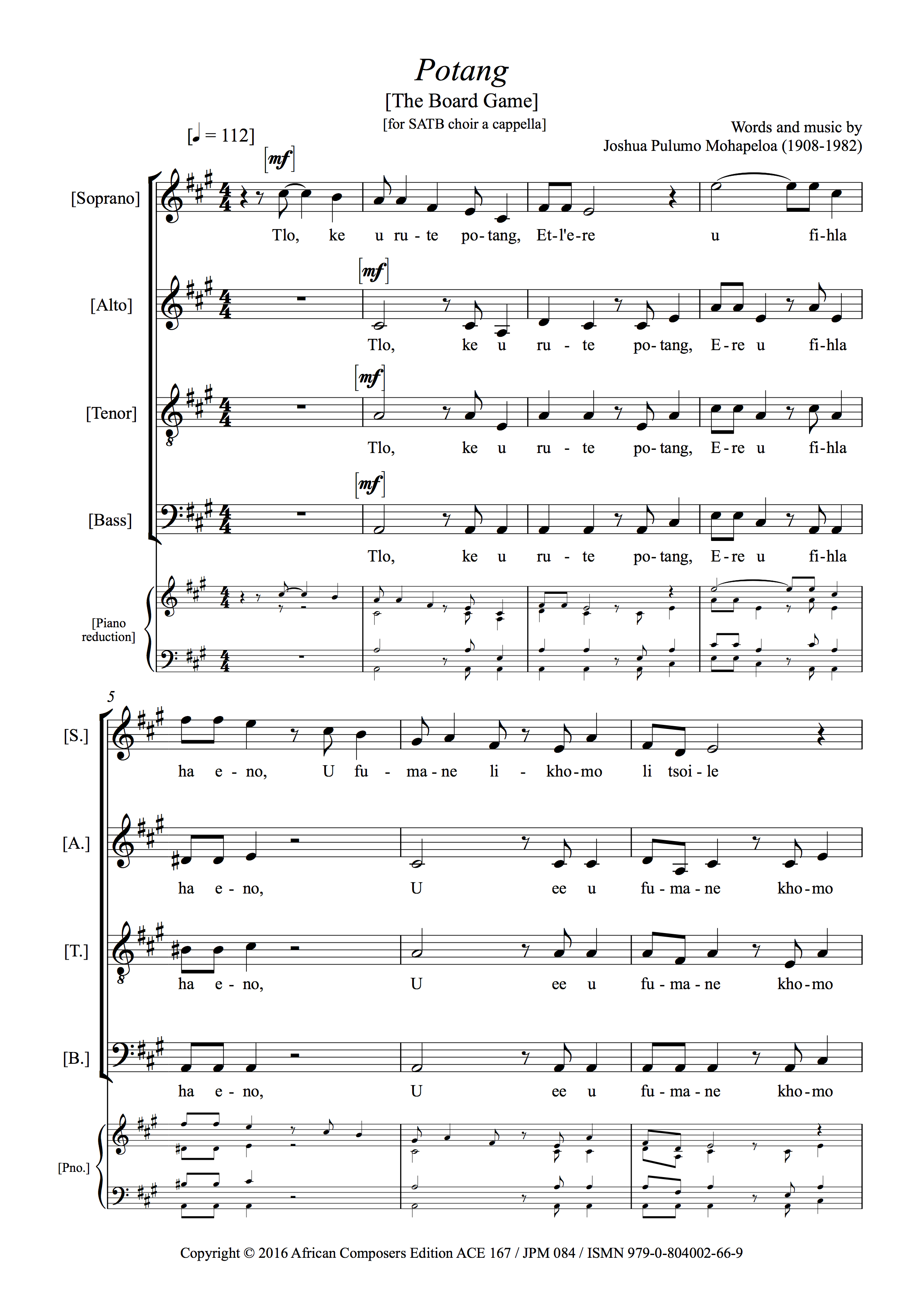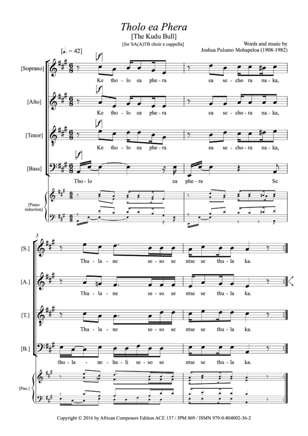 Chabana Sa Khomo was first published in 1935 and Mohapeloa told anthropologist David Coplan in an interview in 1978 that he had based it on two folksongs, one used in the first and one in the second half of the song. The call-and-response first half recalls music ‘as it is sung in the villages … in original Sotho style’, Mohapeloa says, a song ‘sung when the skin is scraped to make a karos [blanket]’, and he creates this antiphony by dividing the choir into two groups of Soprano-Tenor-Bass as can be seen in the example on the right. Mohapeloa did not give any clues about the song that the second half is based on, but it could be ‘Mong’a kobo’ (Owner of the hide). This was recorded by Hugh Tracey in Lesotho in 1951/52 and is in the sound archive of the International Library of African Music (ILAM) in Makanda (Grahamstown), South Africa. As with some of Mohapeloa’s other pieces, Chabana Sa Khomo can be sung by mixed choir or male-voice choir. The score sample shows the version of the score in dual notation for mixed choir and it is also available just in staff notation. The audio file of a male-voice choir given below was originally recorded in Johannesburg in late 1936 or early 1937 and was reissued on CD in 2014 by ACE.