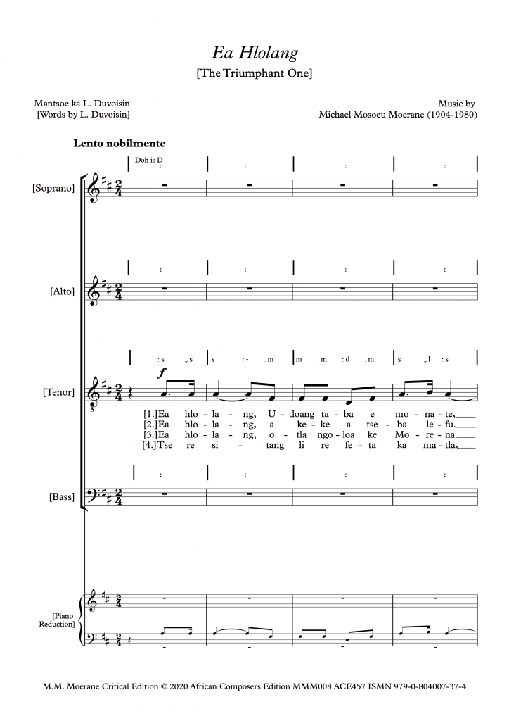 Ea Hlolang is a rousing anthem of four verses, beginning in call-and-response style. It originated as hymn no. 122 in Lifela tsa Sione (Songs of Zion), the Sesotho hymnal that Moerane must have known very well as a member of the Lesotho Evangelical Church. This hymnbook was first published in 1844 with many of its texts written by Lesotho missionaries and music drawn from composers of the day: the original tune of Ea Hlolang was written by 19th-century French composer, Ignaz Pleyel, for example. Moerane does not alter the text by missionary Louis Duvoisin, which draws upon natural imagery – fountains, reeds, and palms – found in the Bible, but he creates a new musical setting that is triumphal and uplifting. In order to help choirs learn this song, a free mp3 of the lyrics spoken by Mpho Ndebele is downloadable when the song is purchased along with a rehearsal mp3 of the song at a slow tempo.