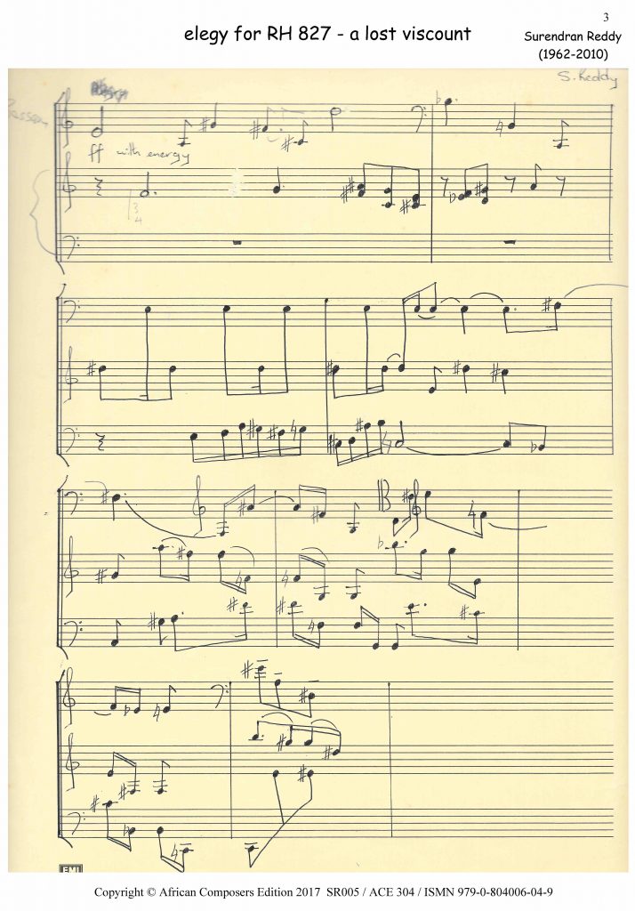 The 16-year-old Surendran Reddy composed this work for bassoon and piano in 1979 in response to a passenger plane, an Air Rhodesia Vickers Viscount RH 827 being shot down in his country of birth, Zimbabwe, by the Zimbabwean People’s Revolutionary Army, killing all 58 people on board. Reddy was in his 1st year of Bachelor of Music studies at the Royal College of Music, London, at the time. The 4-page elegy is in free atonal style with some elements of serialism and constantly changing meters. The score is a facsimile of the original manuscript.