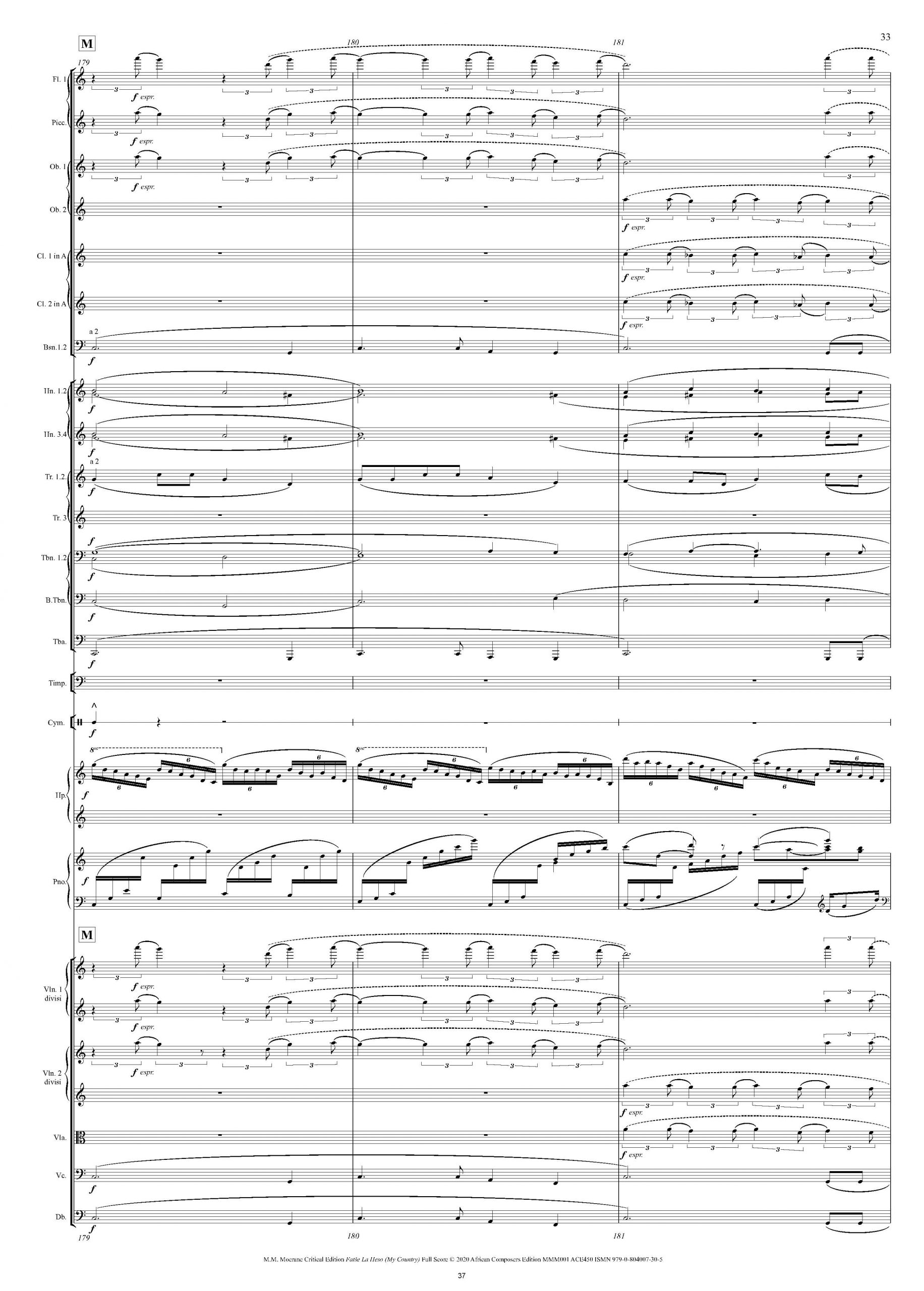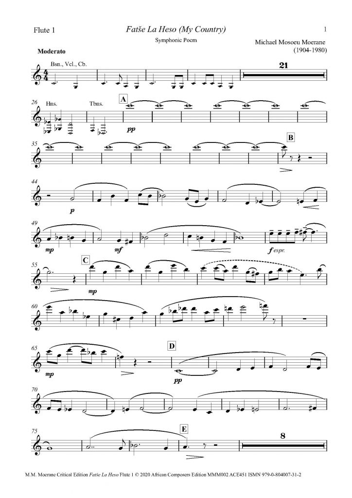 This set of 30 orchestral parts accompanies the full score of Fatše La Heso (My Country) which is available elsewhere on this site. The work is scored for 2 flutes (2nd doubling piccolo), 2 oboes, 2 clarinets in A, 2 bassoons, 3 trumpets, 4 horns, 3 trombones, tuba, harp, piano, timps, percussion (bass drum, cymbals, and tam-tam & triangle – the latter combined into one part), and strings. The set of parts is downloadable as one continuous pdf file of 117 pages, and includes comments on many points of interest in Moerane’s original manuscript full score, including phrasing and dynamics. Each part is paginated separately (i.e. beginning on p.1) with due consideration for page turns and with copious cues. The featured image shows a sample from the 1st Flute part. The first recording below is Track 8 of Timbila: Orchestral Works Inspired by Elements in African Music played by the National Symphony Orchestra of the South African Broadcasting Corporation and conducted by Edgar Cree (Claremont Records, CD GSE 1513, 1991). The second recording below is Track 6 of South African Orchestral Works, Vol. 1 played by the same orchestra and conducted by Peter Marchbank (Naxos/Marco Polo DDD 8.223709, released 1994).