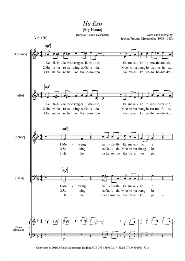 Mohapeloa wrote ‘Ha Eso’ in the 1930s, first publishing it in Morija in 1939 as the fifth of 32 songs in Meloli le Lithallere tsa Afrika ka J.P. Mohapeloa: Buka ea Bobeli (African Songs and Extemporary Harmonizations by J.P. Mohapeloa: Book II). Mohapeloa continued numbering songs in Meloli II – his second songbook – from where his previous book, Meloli I ended; thus Ha Eso is song No. 37 in Meloli II, not No. 5. This song complements the previous one in the book, ‘A Re Een’g, telling of the homesickness of being in Johannesburg rather than the excitement of going there; and the text begins ironically: for to most poor black people in Johannesburg in the 1930s, it was anything but “beautiful buildings … joy and happiness … plenty of food”. Mohapeloa experienced the contrast between pleasure and regret, excitement and suffering many times during his sojourn on the Reef between 1938 and 1943, and must have seen many Basotho hearts broken.