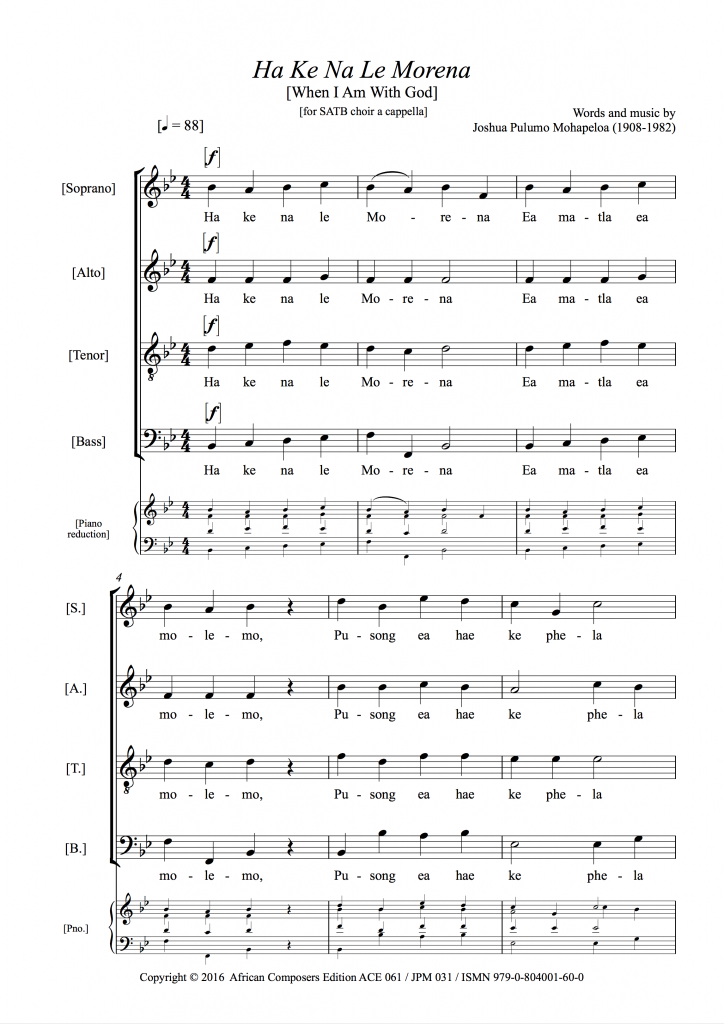 Mohapeloa wrote many songs for Christian worship, like this one, suitable for use in church as a congregational hymn or choir anthem. The church that the Swiss-French missionaries established first entered Moshoeshoe’s kingdom in 1833 and is now called the Lesotho Evangelical Church. Mohapeloa was a staunch member, and conducted the church choir in Morija, the mission village in south-west Lesotho where he spent most of his life. Songs like ‘Ha Ke Na Le Morena’ voice the strong bond between an African church and African society.