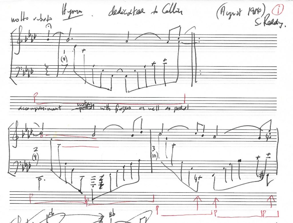 The hymn work ends the set of four piano pieces with which Reddy was occupied between c1978 and August 1984. There are two versions of the manuscript, a 4-page rough autograph score and a fair copy minus page 1 that had obviously once been pasted into a performance book with adhesive tape. The autograph has some pedal marks whereas the much more legible fair copy doesn’t, and so the decision was made to include both here, first the autograph and then pages 2-4 of the fair copy. (NB: the two versions do not have the same number of bars on each page.) The work is a study in 19th-century piano writing à la Liszt, and is dedicated to Collin Sabapathy, an artist and colleague of Reddy’s in the Fine Art Department at Durban-Westville University, South Africa, during the early 1980s. The performance by Reddy shown below was recorded at the University of Zululand in 1982.