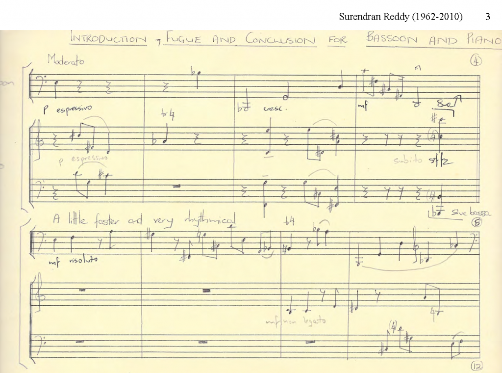 Reddy’s introduction, fugue and conclusion for bassoon and piano (the title on the manuscript) is a short, atonal, multi-metered piece in three sections, composed when Reddy was 16. It is his first composition, composed in 1978, and shows how well he had absorbed the language of modernism at such a young age. The ACE score is a facsimile of the original manuscript