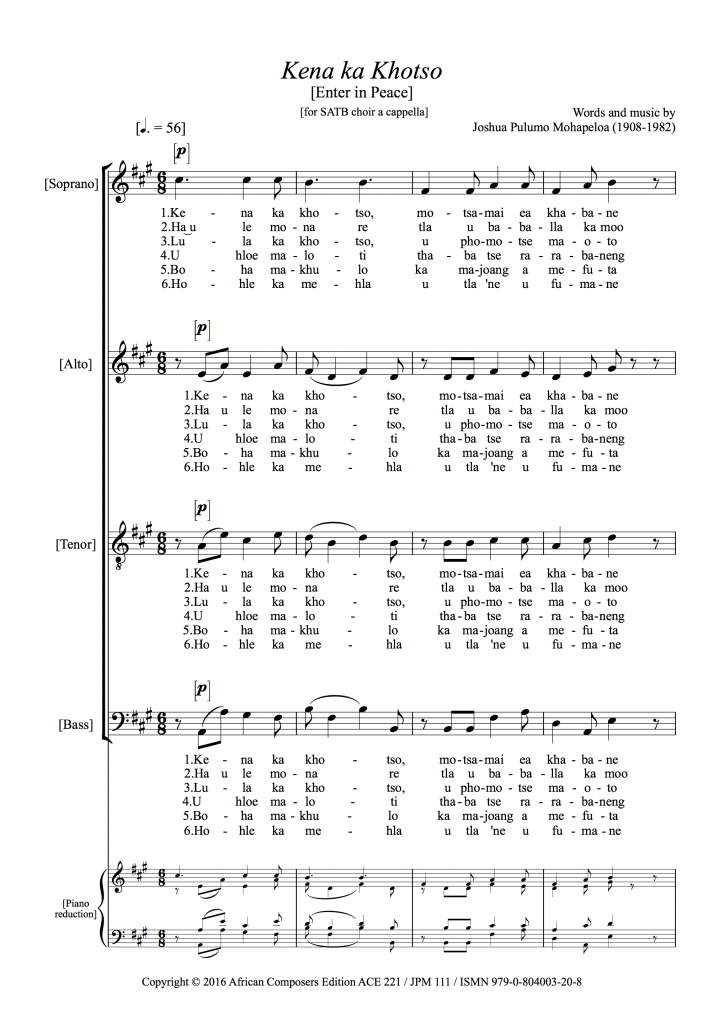 Mohapeloa completed ‘Kena ka Khotso’ in 1976 when it was published in Cape Town as song No. 14 of 25 in Meluluetsa ea Ntšetso-pele le Bosechaba Lesotho (Anthems for the Development of the Lesotho Nation). The song partners Mohapeloa’s earlier song ‘E-eang ka Khotso’ (Go in Peace) published in the collection Khalima-nosi tsa ’Mino Oa Kajeno in 1951. Both phrases -‘come in peace’ and ‘go in peace’ – are important in Lesotho’s cultural life, greetings found at the country’s border posts, for example. This song indicates that by 1976 Lesotho had a healthy tourist trade and offers a rosy view of the country, emphasising the hospitality as well as the natural beauty of a place often called ‘the mountain kingdom’ or ‘the kingdom in the sky’, because almost half the country covers the highest mountain range in southern Africa, the Maluti (Drakensberg). For Basotho, their country is always associated not only with mountains but also with its founder, Moshoeshoe I, who forged them into a nation in the mid nineteenth century.
