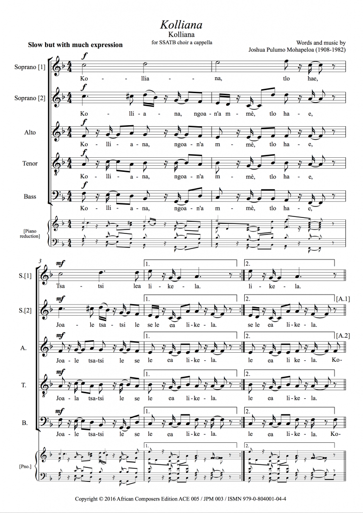 ‘Kolliana’ is a name in Sesotho, the language of Lesotho, and it can be either a boy’s or a girl’s name. In the song Kolliana, a child who is out playing when it is getting late is called home. It was first published in tonic solfa notation in 1935 and is scored for SSATB, second Soprano becoming first Alto in bars 5-12, then reverting to second Sop. The Bass covers a wide register with some very low notes – such as C two octaves below Middle C – which recall the male-voice style of traditional Sotho mohobelo songs. Relentless syncopations, on the other hand, are influenced by jazz styles of the 1930s, and the writing is multi-layered with voices often crossing. The score sample on the right shows the version of the score in staff notation and it is also available in dual staff-solfa notation. The audio file of a male-voice rendition given below was originally recorded in Johannesburg in 1937 and was reissued on CD in 2014 by ACE.