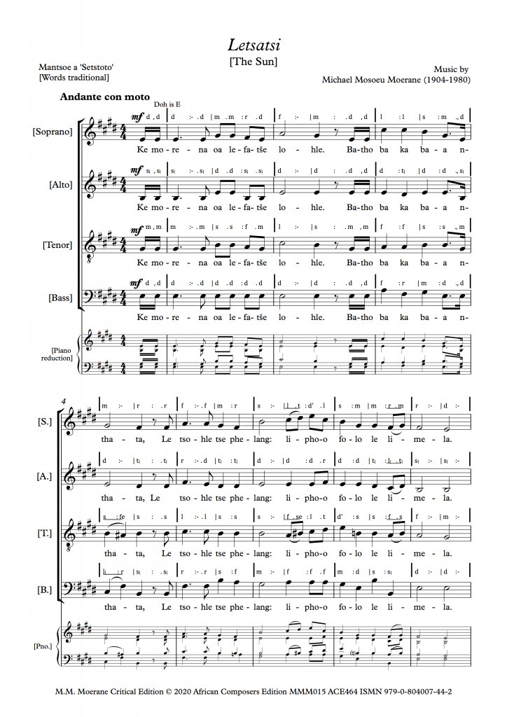 In this rousing, humorous song, the sun is the narrator, declaring himself king of all good things in the world including plants, animals, clouds, heat, and even cold: the king of everything! The sun may control people’s lives, however, but not their opinions of the weather, which is parodied by the sun in the way in which it is often complained about in African communities: it is never just hot or cold, the lyrics of Letsatsi tell us, but always ‘too hot’ or ‘too cold’! People are just never satisfied with the weather. Moerane attributes his lyrics to ‘Setsoto’ (Trad.). In order to help choirs learn this song, a free mp3 of the lyrics spoken by Mpho Ndebele is downloadable when the song is purchased along with a rehearsal mp3 of the song at a slow tempo.