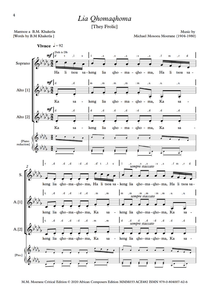 In rural Africa, children customarily look after family livestock, even before and after school, as a way of helping out with the family chores. Lia Qhomaqhoma tells how a child delights in such a chore and becomes very protective of the frolicking lambs. It is without doubt based on Moerane’s own personal experience of growing up on a farm in rural South Africa. The music is very fast, full of staccatos, accents, slurs, and repeated notes, suggesting that the song was written for school use. In order to help choirs learn this song, a free mp3 of the lyrics spoken by Mpho Ndebele is downloadable when the song is purchased along with a rehearsal mp3 of the song at a slow tempo.