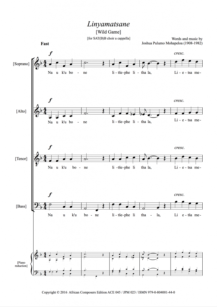 ‘Linyamantsane’ means wild game (referring to animals rather than birds) and the text focuses on the ubiquitous southern African springbok (‘litšephe’ in Sesotho). This small deer loves to frolic and jump, especially during the mating season, and when the Basses divide in bars 15-26 they mimic the snorting sound they make: ‘pawm pawm’. The Basses are in many ways the most important voices in Mohapeloa’s songs, and he draws on their low register very effectively here. Indeed, every part has a wide vocal range and many leaps, perhaps in imitation of the springbok’s antics.