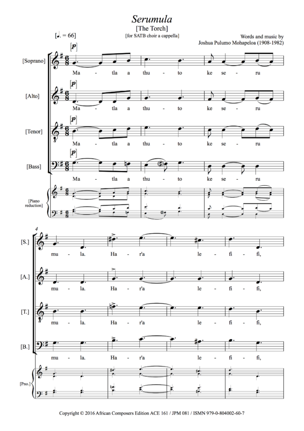 The youth of 1951 Lesotho and South Africa were into jazz, dancing, and the fashionable modernities of the time. This was the youth for whom Drum magazine was founded, in the same year that Mohapeloa published the volume of songs called Khalima-Nosi tsa ’Mino Oa Kajeno: Harnessing Salient Features of Modern African Music, in which ‘Liphala’ first appeared. Vocal jazz was particularly popular at this time, and its syncopated punchy rhythms infuse ‘Liphala’. The word, pronounced ‘dipala’, is a plural noun meaning whistles, pipes, bugles, trumpets, or horns – any loud musical sounds used to summon people – and in reference to this song it is the summons to school. The text reinforces the importance of education for modern Africans, key to upward social mobility and political liberation. The message in the song is hugely positive: schools are places of joy that one should look forward to attending, hence the frequent call, ‘peperi …pepe’ (the horn call) which reverberates throughout the song.