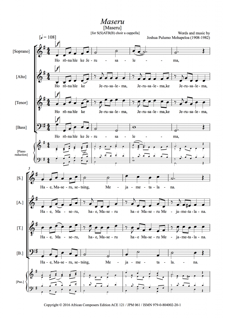 Maseru is the capital of the small mountain kingdom of Lesotho, in the west of the country close to the South African border, and is also the end of a branch line that links Lesotho by rail with the rest of Africa. It was from Maseru station that tens of thousands of migrant workers sought work in South Africa. Mohapeloa commemorates these journeys in other songs. Here he simply praises Maseru as the bustling commercial and administrative centre of the country, its capital city. Topographically, is characterised by rocky hills and sprawling, haphazard design, with lots of greenery visible between the built-up areas; and this would have been even more the case in the late 1930s, when ‘Maseru’ was composed. Hence Mohapeloa’s reference to ‘green pastures’. Today, in addition to large government buildings, the city has an airport, a university (The University of Lesotho at Roma, just outside Maseru), a college of education (Lesotho Teachers’ Training College), and several schools and hospitals; and is the headquarters of the Lesotho National Broadcasting Corporation, among other important national institutions.