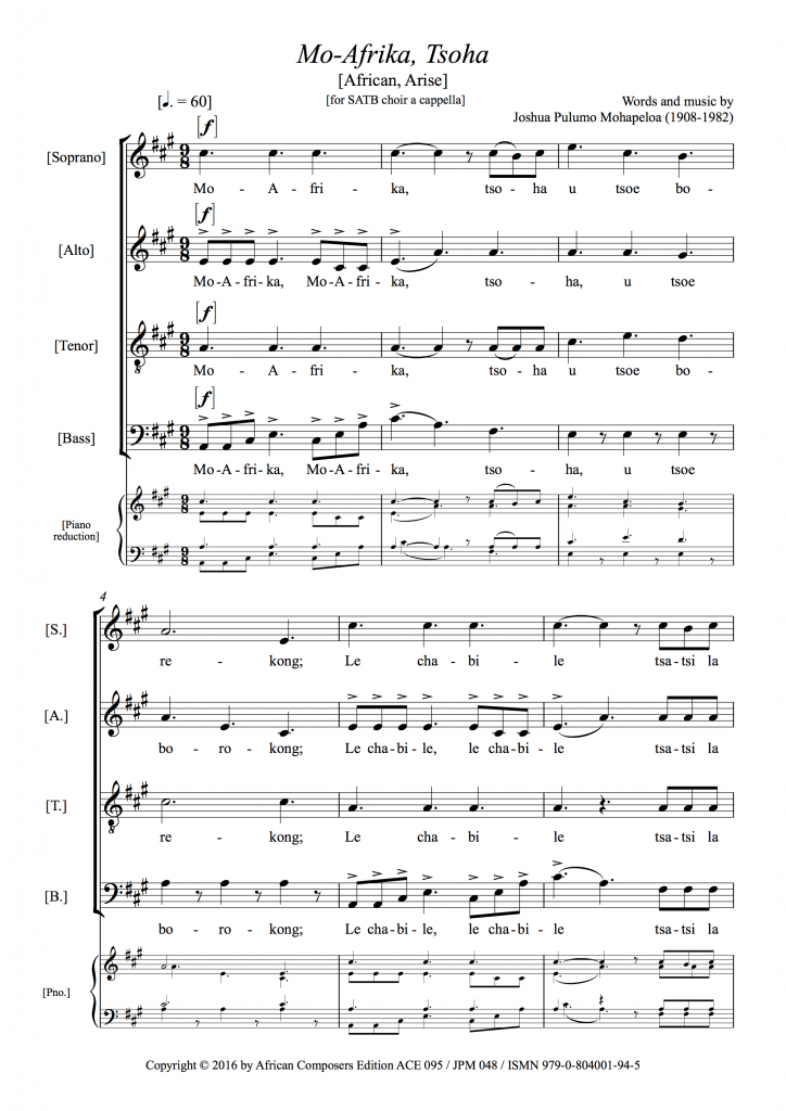 There are several songs in Mohapeloa’s songbooks Meloli II, even more in Meloli III, songs that exhort, Africans, or in this case, the ‘African’ to see the changes happening around them. The songs remind us that World War II broke out soon after the book was published, a war in which many Basotho were killed, most of them in non-combatant roles on foreign soil. It was, however, to be many years (1966) before Lesotho attained the independence that Mohapeloa urges his fellow Basotho to strive for in this song. ‘Mo-Afrika, Tsoha’ speaks to an inertia, or perhaps inner political turmoil of his country as it progressed towards that independence. Mohapeloa uses compound triple time to capture the sense of being lulled to sleep, and the hammering rhythm of Alto and Bass (accents on every note, at first) to express the urgent need to wake up.