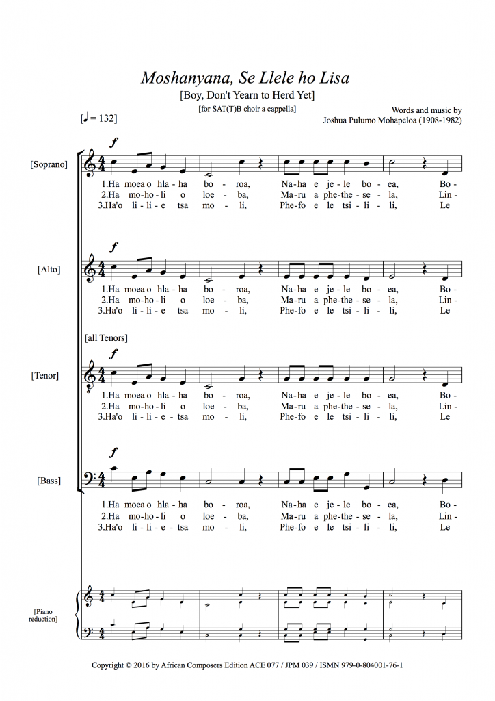 Mohapeloa first published ‘Moshanyana, Se Llele ho Lisa’ in Meloli le Lithallere tsa Afrika ka J.P. Mohapeloa: Buka ea Bobeli (African Songs and Extemporary Harmonizations by J.P. Mohapeloa: Book II) in 1939. The song addresses the way Basotho men typically spend much of the year tending flocks, moving them from one grazing place to another. Wear a blanket thrown over their shoulder, a pointed hat and wellington boots, and carrying a stout stick, herdsmen are still one of the most common sights in Lesotho. Mohapeloa did his own share of herding as a boy and would have sympathised with dread of the severe Lesotho winters. As his brother remembers, Pulumo learned how to draw water with a sponge made of grass ropes and knit hats out of wool and grass, and so it is not surprising, therefore, that “Basotho ways, old and new, that he learned from home, at school, herding, doing different kinds of jobs, are evident in many of his songs” (Mohapeloa and Phakisi 1987 – the back page of score gives this source).