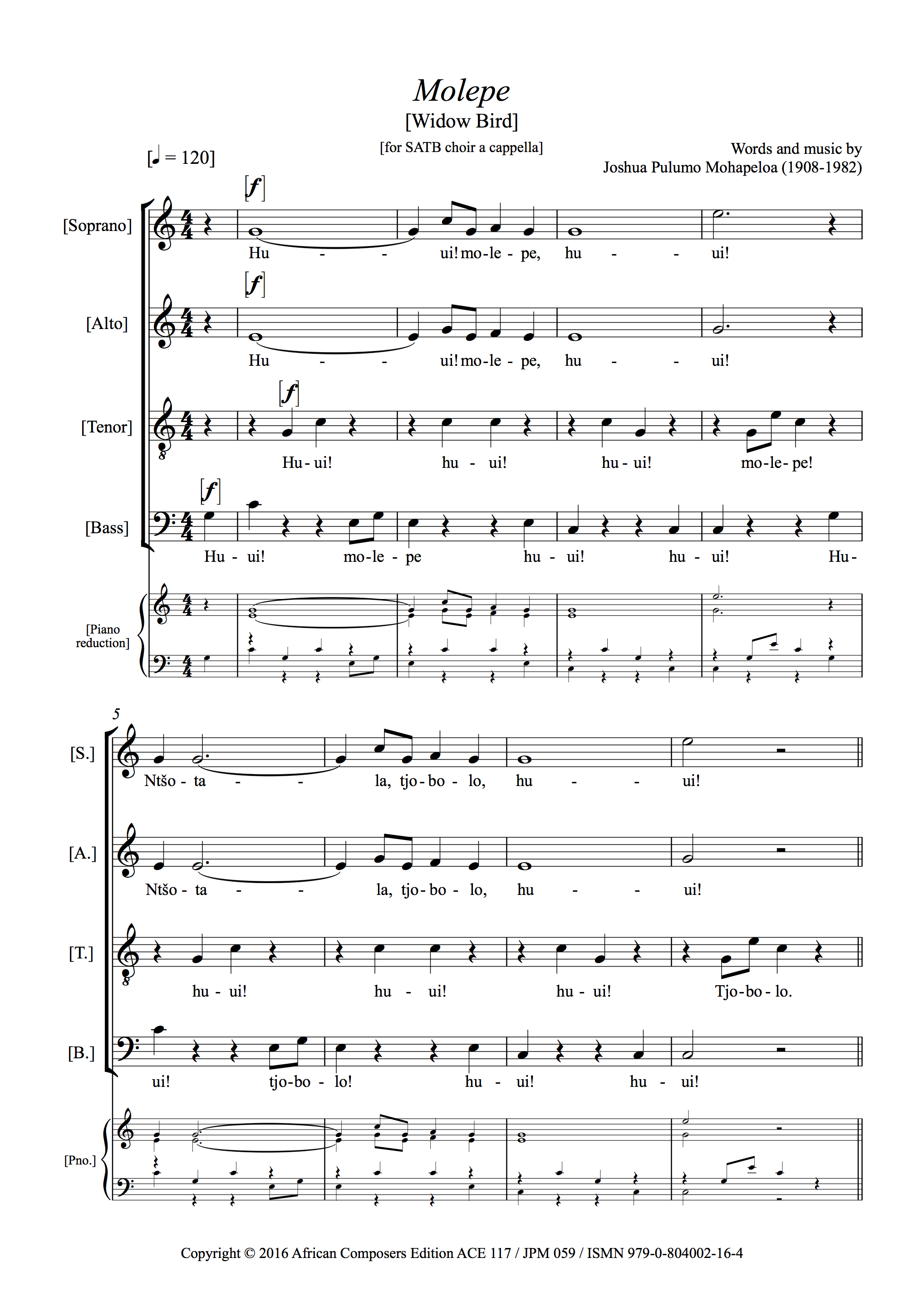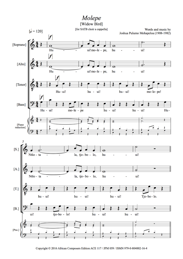 Mohapeloa composed ‘Motjoli, Nong Kholo’ in the early 1930s, publishing it in 1935 as song No. 28 in his first collection of 32 songs, Meloli le Lithallere tsa Afrika. Motjoli is the third of three consecutive ‘bird’ songs, 26, 27, 28 and one of several songs he wrote about birds and animals. This arose partly because of his enforced idleness in 1929-30 recovering from TB, when he spent a lot of time sitting on the porch of his family’s house in Mohalinyane, observing nature. Like ‘Sephōkō’ (JPM 027) ‘Motjoli’ refers to the Lesotho national instrument, the lesiba. The phrase ‘nong-kholo’ in the title means a tune played on the lesiba, but together with ‘motjoli’ becomes the Sesotho name for the African Pied Wagtail. This is a small bird, not often seen in flocks, hence the song. The music is in a celebratory, almost rhetorical style, sometimes breaking off in mid-phrase.