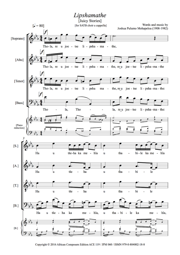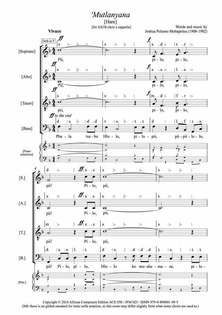 ‘’Mutlanyana’ was the first song Mohapeloa composed, in late 1929. He had just returned to Lesotho from the eastern Cape, where the diagnosis of tuberculosis had interrupted his studies at the South African Native College in Alice (now Fort Hare University). The only cure for TB in those days was rest and sun baths, and Mohapeloa spent many months undergoing this cure at his parents’ home in southern Lesotho. It was here, his brother notes, that he “started writing what I called music, in a playful way [and] this finally became the work that is known as ’Mutlanyana”. J.M. Mohapeloa continues, in his biography of the composer (1987):