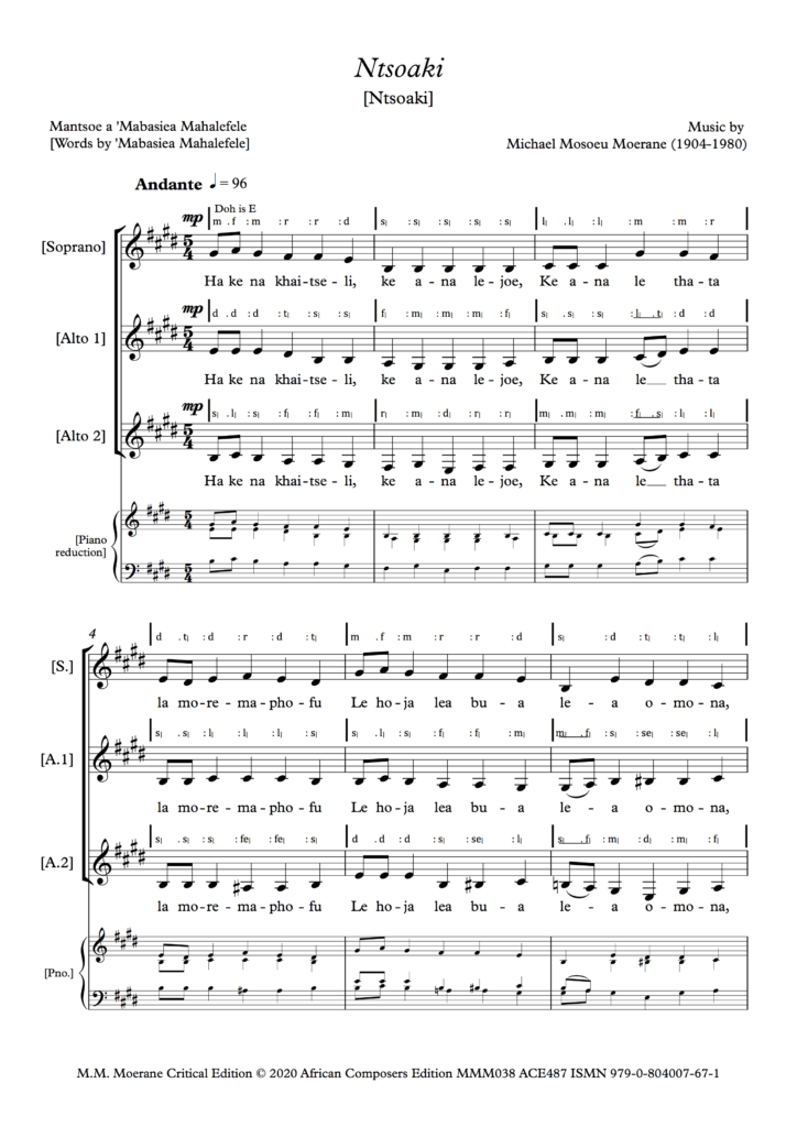 The word ‘ntsoaki’ in Sotho culture refers to the birth of a girl after several boys, and it means ‘one who mixes’. The word can also be used as a proper name, ‘Ntsoaki’. In the song for female voices, Ntsoaki, Moerane used verses 1 and 2 of a poem by Sesotho poet ’Mabasiea Jeannette Mahalefele that was published in 1971, and so it is possible that the song might date from the early 1970s. Only 22 bars long, it is in a flowing 5/4 metre, unusual for Moerane, and its sweetness partly derives from the way he blends the lower registers of the female voices so well. In order to help choirs learn this song, a free mp3 of the lyrics spoken by Mpho Ndebele is downloadable when the song is purchased along with a rehearsal mp3 of the song at a slow tempo.