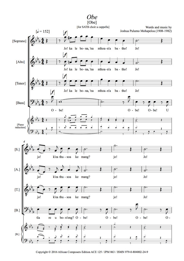 ‘Oa Iteli-telisa’ tells of trying to stop a child crying. It is not a soothing lullaby in the European sense but a humorous song. Mohapeloa was the fourth eldest of ten children, and later had four children himself, and he was well versed in a folk culture where there were a number of children’s songs and games, and he consciously reflects the meaning of the text in his music. ‘Oa Iteli-telisa’ has the feel of a children’s song, but also the feel of an entertainment song of the type that was sung all over southern Africa in the earlier twentieth century, not only in schools and villages but also in township concerts and vaudevilles, where there might also be sketches, jazz, and dancing.