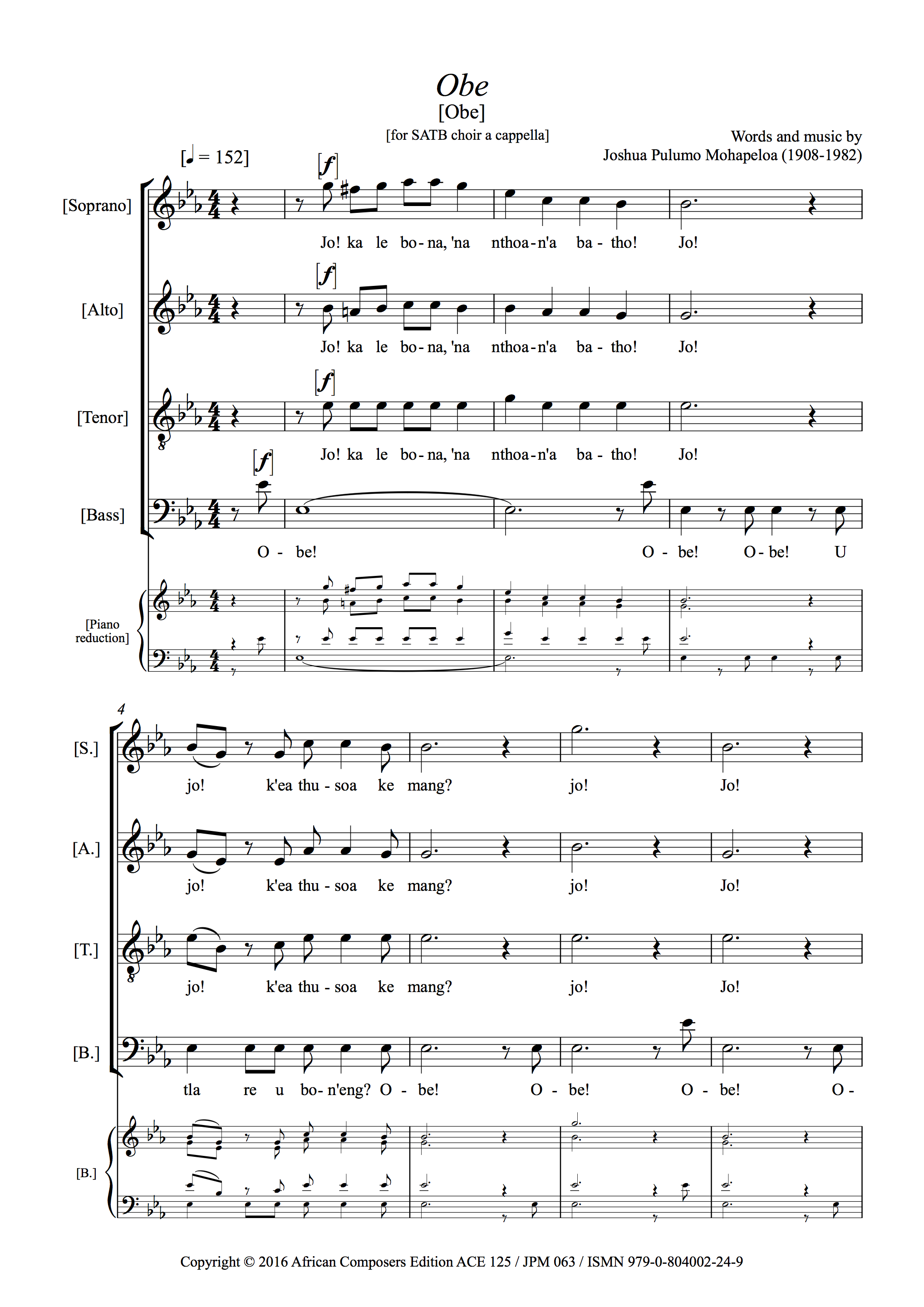 ‘Oa Iteli-telisa’ tells of trying to stop a child crying. It is not a soothing lullaby in the European sense but a humorous song. Mohapeloa was the fourth eldest of ten children, and later had four children himself, and he was well versed in a folk culture where there were a number of children’s songs and games, and he consciously reflects the meaning of the text in his music. ‘Oa Iteli-telisa’ has the feel of a children’s song, but also the feel of an entertainment song of the type that was sung all over southern Africa in the earlier twentieth century, not only in schools and villages but also in township concerts and vaudevilles, where there might also be sketches, jazz, and dancing.
