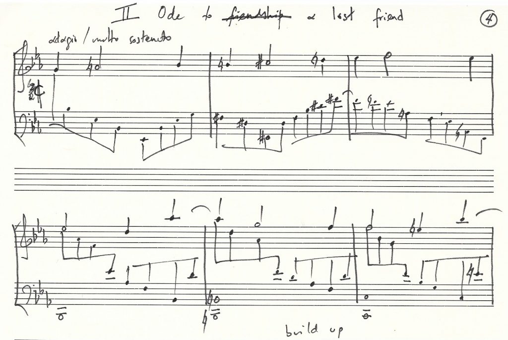 Originally entitled ‘Ode to friendship’, Reddy changed the title at some point to ode to a lost friend, which better reflects the sense of yearning this solo piano piece embodies and the Wagnerian harmonic world it references. Like the other three pieces in the set, it was composed in 1985 directly in pen, hence the frequent crossings out and rather provisional notation especially in some of the left-hand accompanying passages, which have to be ‘imagined’ or indeed, improvised.