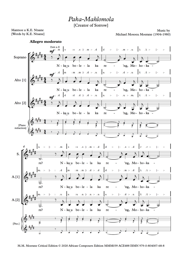 The ‘creator of sorrow’ (paka-mahlomola) in this song for three female voices is the Mohokare or Caldeon River. This is the river that separates Lesotho from South Africa, a long river whose source is in very high mountains in east Lesotho and which then meanders for hundreds of kilometres westward, dividing Lesotho from South Africa. During apartheid, it divided a country where people were free to live where they liked from a country where they were treated as ‘Blacks’, and where they suffered accordingly, at every level. The sorrow of crossing this river surely refers to this history, but it might also simply refer to the fact that someone dearly loved lives permanently on the ‘other’ side. As a result, the overall mood of the music is rather sad, and the work is written in several contrasting sections. In order to help choirs learn this song, a free mp3 of the lyrics spoken by Mpho Ndebele is downloadable when the song is purchased along with a rehearsal mp3 of the song at a slow tempo.