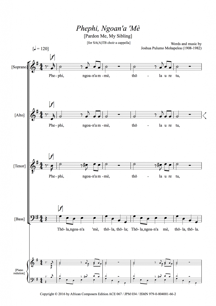This is a comic song, first published in 1939, about an older sibling looking after a younger sibling – a commonplace in African life and especially in Lesotho, where Mohapeloa lived. The older child threaten visitations from all kinds of wild animals on the little brother or sister, if he or she doesn’t stop crying. The phrase ‘Ngoan’a ‘Mè’ literally means ‘Child (ngoana) of Mother’ (mmè), and could refer to either a brother or a sister.