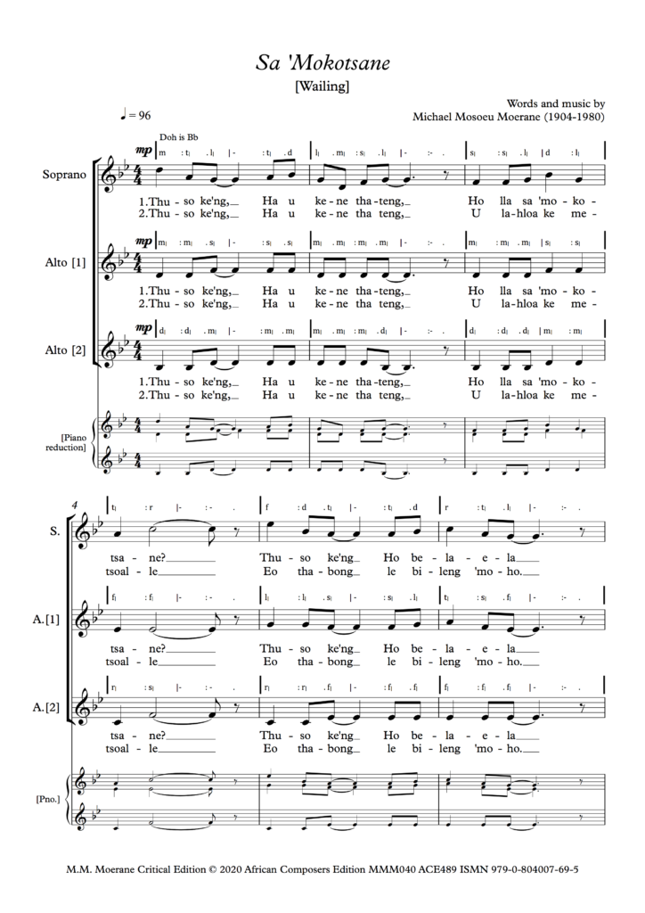 ‘Sa ’mokotsane’ is a common expression in Sesotho to denote a serious and loud wailing, although the song Sa ‘Mokotsane cautions agains too much wailing and gives advice on being courageous in face of difficulties and not complaining. It tries to strike a cheerful tone, therefore, but the way it reaches up to the high notes so suddenly, in places, might be a reference to crying out in anguish. The word ‘thuso’ (help) features prominently in the lyrics (by Moerane) and to a lesser extent the word, ‘tsepo’ (hope). Thuso and Tsepo are the names of Moerane’s son and grandson (Thuso’s son), respectively, and so this might be a clue to the year in which the work was written, 1961, the year in which Tsepo was born. Thuso himself had many sufferings during the 1950s to 70s, including his family’s forced removal from their home, and a banning order. In order to help choirs learn this song, a free mp3 of the lyrics spoken by Mpho Ndebele is downloadable when the song is purchased along with a rehearsal mp3 of the song at a slow tempo.