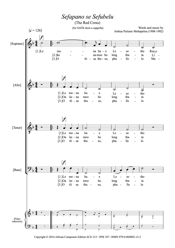 Mohapeloa completed ‘Sefapano Se Sefubelu’ (The Red Cross) in 1974, publishing it in Cape Town in 1976 as song No. 10 of 25 in Meluluetsa ea Ntšetso-pele le Bosechaba Lesotho (Anthems for the Development of the Lesotho Nation). Mohapeloa’s original title included the English ‘Red Cross’ in brackets after ;Sefapano se Sefubelu;, a translation retained here with ‘The’ added. Like many other songs in Meluluetsa the composer celebrates an institution that was established in Lesotho after independence in 1966. It may have had a special significance for Basotho as an organisation founded in Switzerland, since the first missionaries in 19th-century Basutoland had been French-Swiss, but it was certainly an international organisation that it was highly beneficial for Lesotho to join.