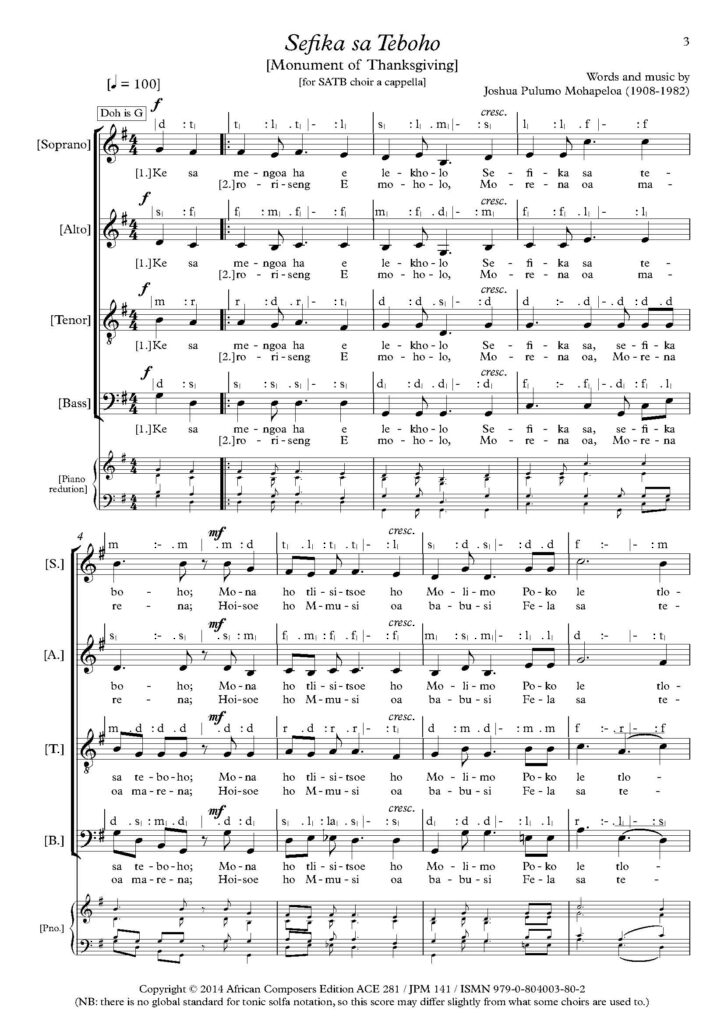 ‘Sefika Sa Teboho’ commemorates the centenary of the founding of the Paris Evangelical Society’s mission station at Masitisi, Lesotho, a centenary that fell on 27 March 1966. That was probably the year in which the song was composed. ‘Sehopotso sa Jubile ea lilemo tse lekholo ea Masitisi’ (A landmark jubilee of the great mission school at Masitisi) is the declaration on the front cover. The song must have been one of “three anthems specially prepared for the occasion” as Annette Ellenberger notes in her report in the Basutoland Witness (No. 69, July 1966, 1) and although the publisher’s name does not appear anywhere on this individually published score, the imprint must be that of Morija Sesuto Book Depot. A photograph on the front cover shows the original wattle-and-daub buildings of the mission, which was built into a hillside (in Sesotho a ‘leoa’ or cave), opposite what eventually became an avenue of neatly planted trees and flowers.