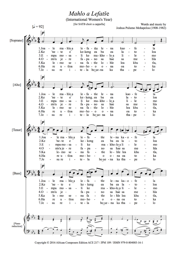 ‘Sefika Sa Teboho’ commemorates the centenary of the founding of the Paris Evangelical Society’s mission station at Masitisi, Lesotho, a centenary that fell on 27 March 1966. That was probably the year in which the song was composed. ‘Sehopotso sa Jubile ea lilemo tse lekholo ea Masitisi’ (A landmark jubilee of the great mission school at Masitisi) is the declaration on the front cover. The song must have been one of “three anthems specially prepared for the occasion” as Annette Ellenberger notes in her report in the Basutoland Witness (No. 69, July 1966, 1) and although the publisher’s name does not appear anywhere on this individually published score, the imprint must be that of Morija Sesuto Book Depot. A photograph on the front cover shows the original wattle-and-daub buildings of the mission, which was built into a hillside (in Sesotho a ‘leoa’ or cave), opposite what eventually became an avenue of neatly planted trees and flowers.