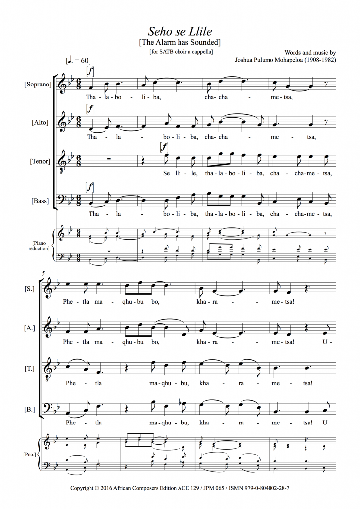 Mohapeloa wrote ‘Seho se Llile’ in the 1940s, publishing it in Morija in 1947 as the first of 28 songs in Meloli le Lithallere tsa Afrika ka J.P. Mohapeloa: Buka ea Boraro (African Songs and Extemporary Harmonizations by J.P. Mohapeloa: Book III). Mohapeloa continued numbering songs in Meloli III from where his previous book, Meloli II ended; thus Seho se Llile is song No. 65 in Meloli III, not No. 1. Like so many songs in this third volume, collected together and published in 1947 after World War II, ‘Seho se Llile’ resonates with ideas of global historic change and the future of Lesotho as an nation state. It reminds us that Basutoland sent troops to fight during WWII, largely in support roles, to defeat the enemies of its colonial master, Britain: to help defend Britain in other words. This experience only fuelled Basutoland’s readiness to fight for its own right to independence.