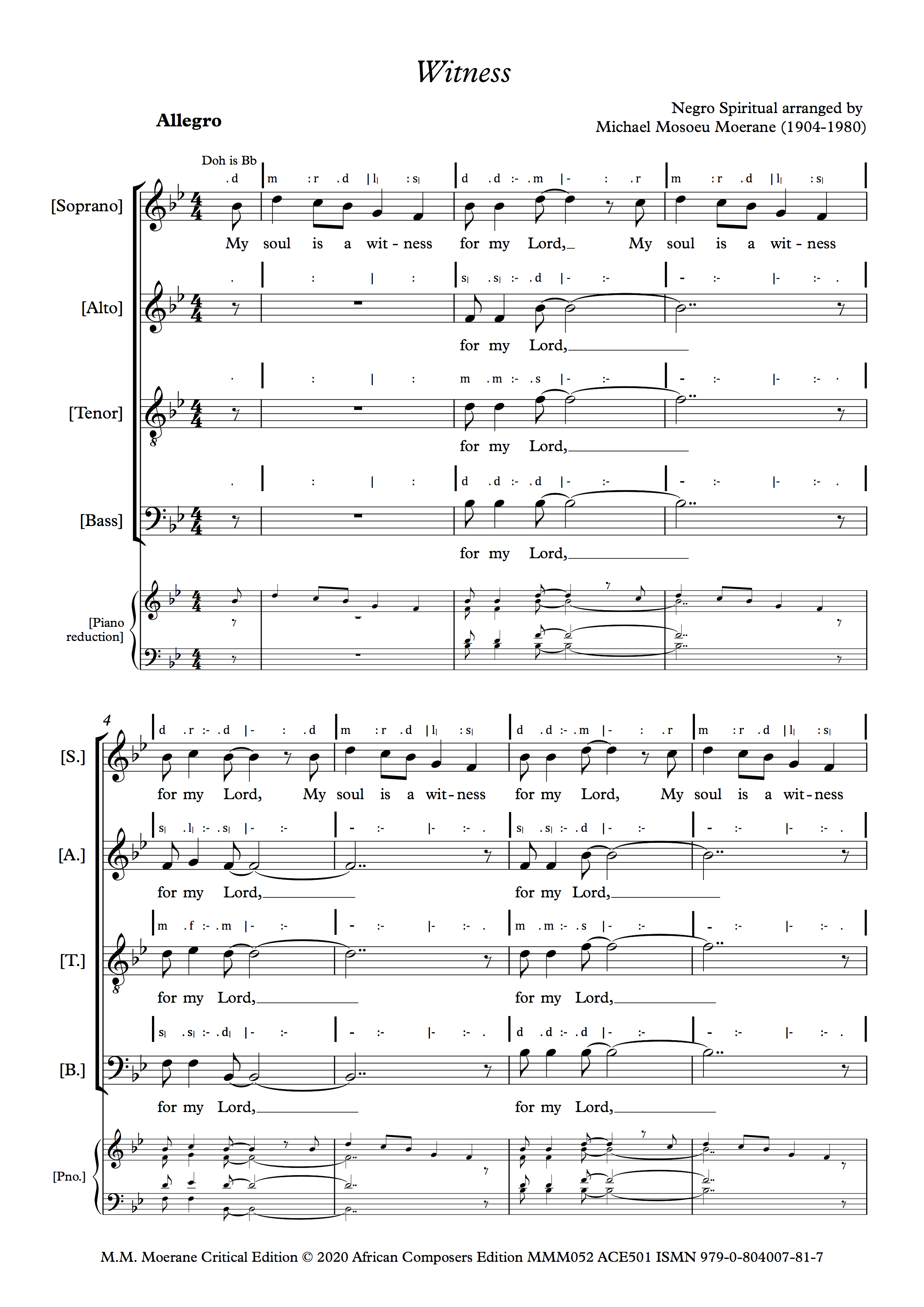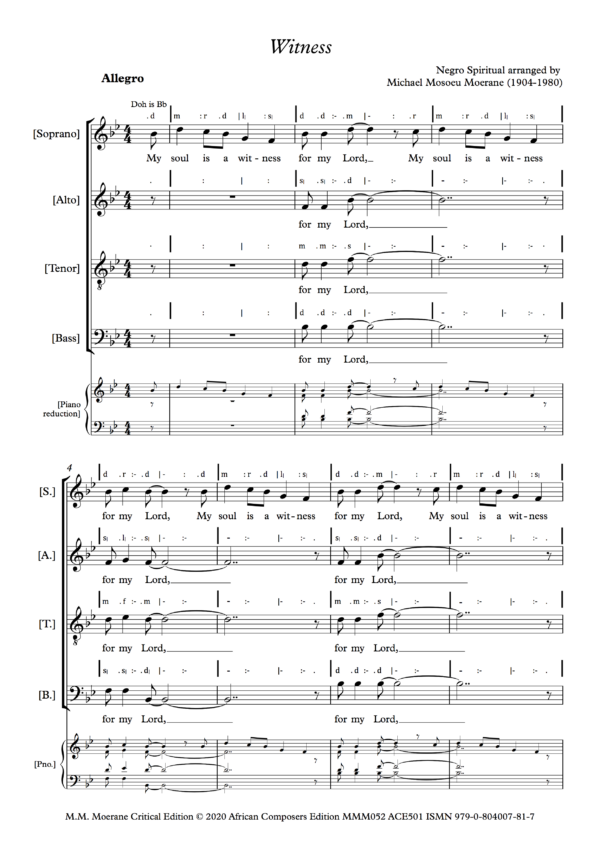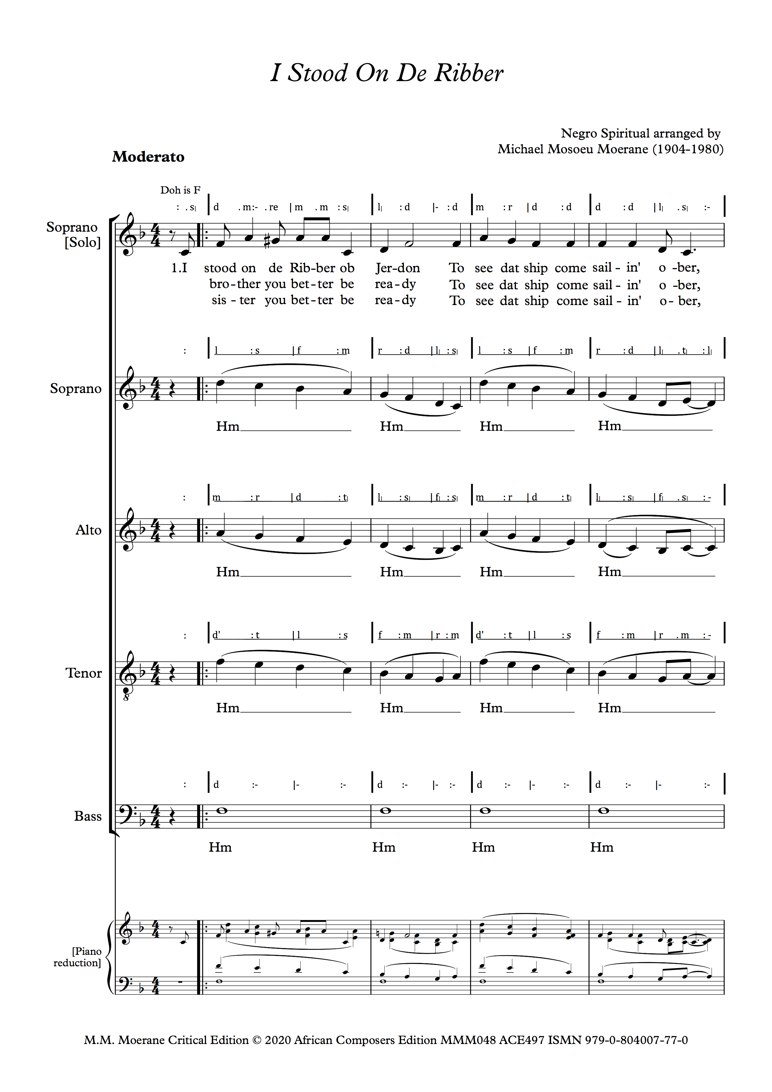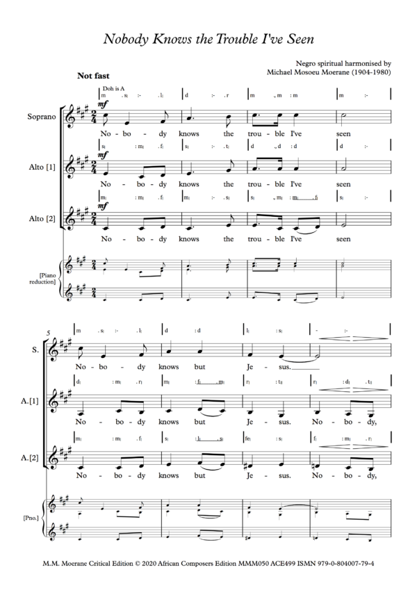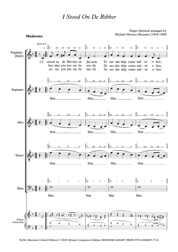 Moerane’s arrangement of Shenandoah has a wonderfully varied texture, beginning TTBB, changing to SATB and then to SSATB during the course of which the melody moves from voice to voice. The original tune, ‘Shenandoah’, is an American folksong about Iraqois Chief Shenandoah from Virginia, the state whose major river is named after him. The song is usually known as a ‘sea shanty’, and Moerane found the source for his arrangement in Sailor Shanties by Richard Runciman Terry, published by Curwen in the 1920s or 1930s. He may have made this arrangement in the late 1930s, around the same time that Lovedale Press published his arrangement of Nobody Knows the Trouble I’ve Seen. An arrangement of the song on Youtube by Mark Patterson filmed in the Shenandoah National Park has a melodic line somewhat different from Moerane’s. Moerane makes the tune more of a sea shanty. In order to help choirs learn Moerane’s choral version, a free rehearsal mp3 at a slow tempo is downloadable when the song is purchased.