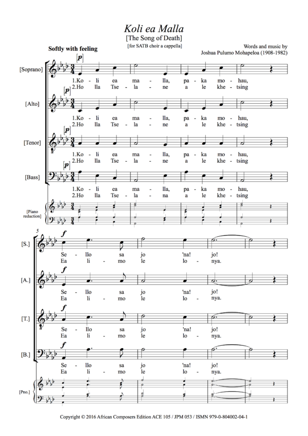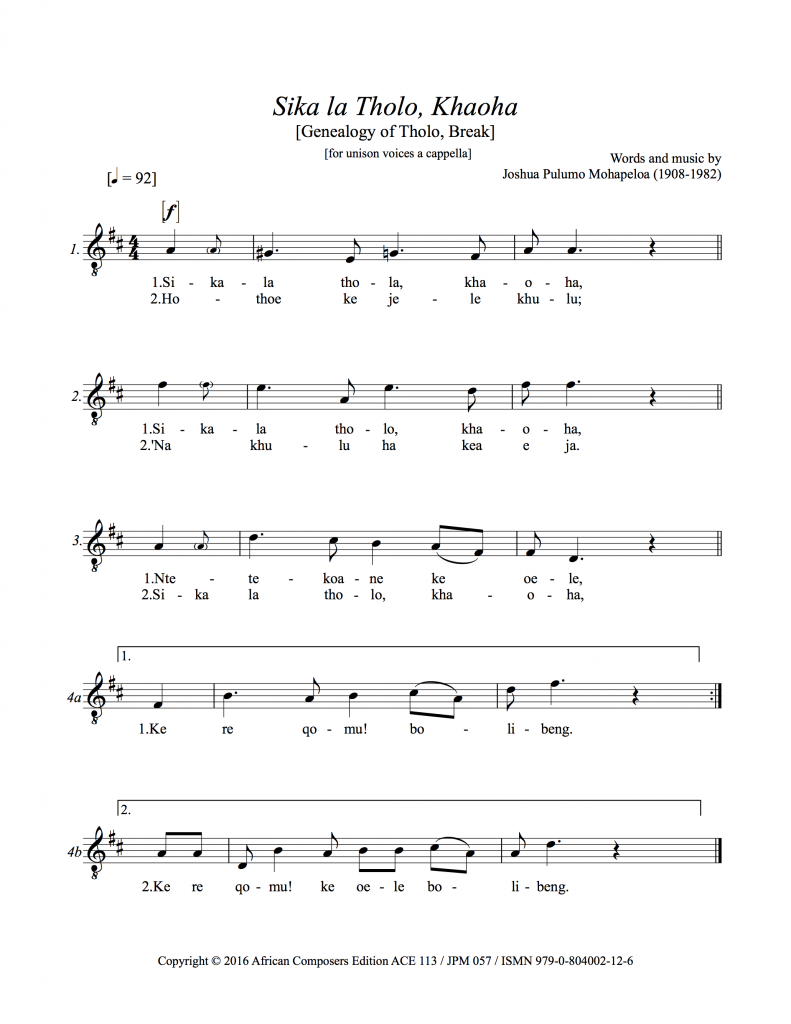 ‘Sika la Tholo’ is cryptic, unique in Mohapeloa’s output not only because it is not harmonised but unison: no doubt intended to be sung unison rather than solo, but it could be sung as a solo, but at only eight bars it is his shortest work. There is something about the way the score is written that suggests it could be sung as a round, and musically, this would work. One also remembers that these songs were written for schools, and schoolchildren no doubt knew some Western rounds, so it would have been novel to write a Sesotho one. There is also a sense in which it seems to be rooted in a traditional song; but whatever source(s) inspired it, it has been adapted to Western-style singing. Lineage, families and larger clans are extremely important in the social life and history of Lesotho, a small country whose people are largely descended from a handful of major clans in the region during the preceding centuries.