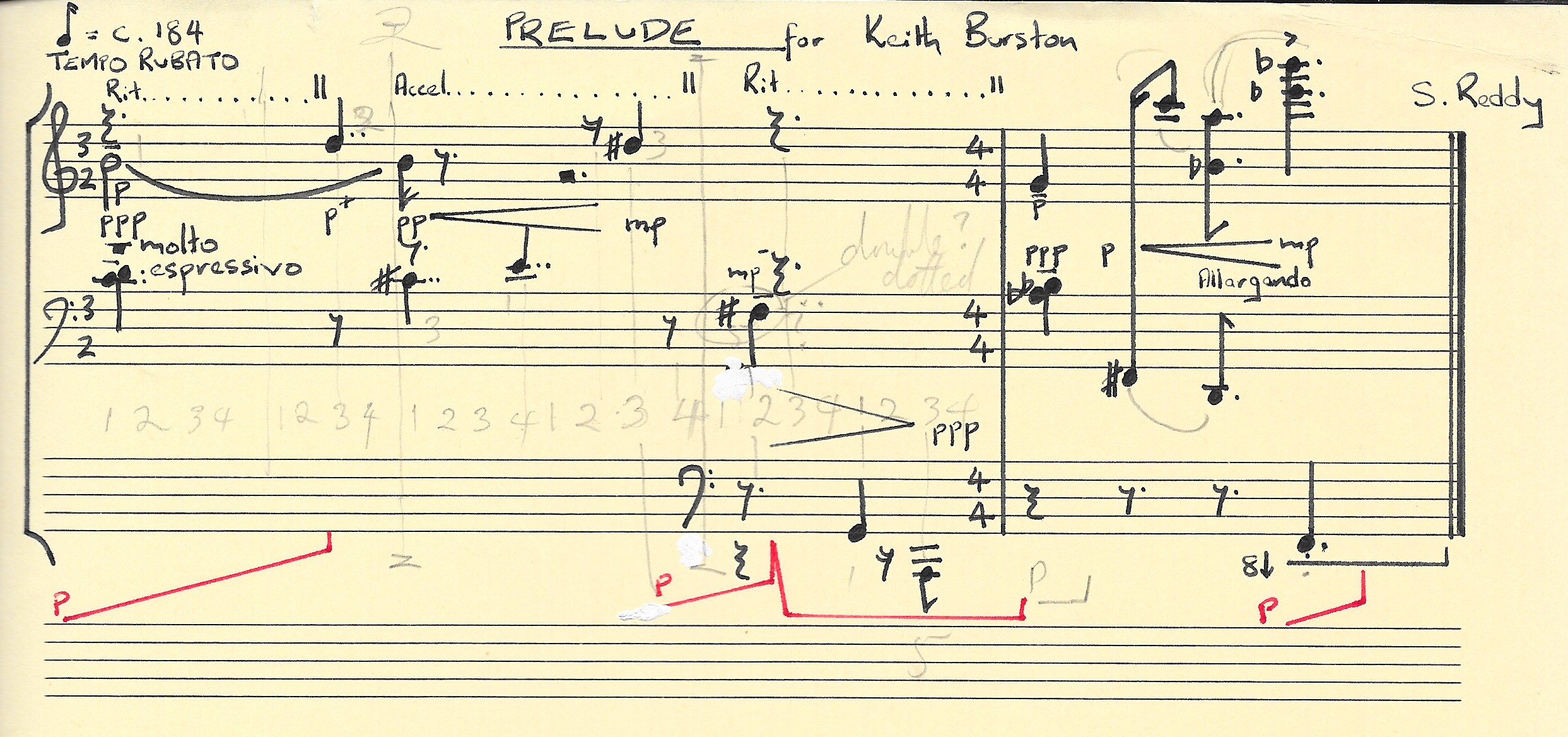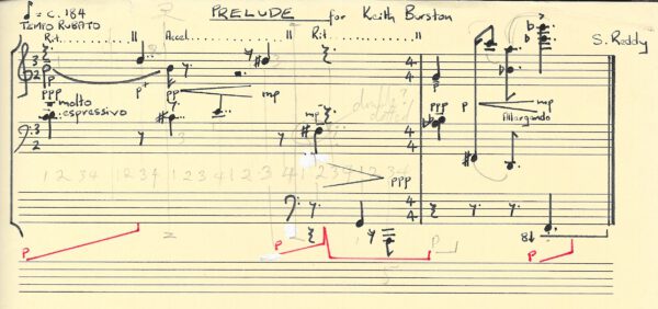 Reddy left seven Sibelius files, the last dated 8 August 2009. The work is titled ‘Sonata “f-a-i-r-p-l-a-y”‘ on the score, and subtitled ‘for violin and piano on equal terms’, and it is dedicated to violinist and great friend of Reddy’s, Michael Wiener, as was sonata I. The ACE score presents the work with no change except reformatting to make some notation and annotations more legible, although it is obvious that Reddy learned from the experience of notating sonata I and far fewer edits were needed in order to prepare sonata II for publication. Reddy made an mp3 file from the final Sibelius score, which is given below.