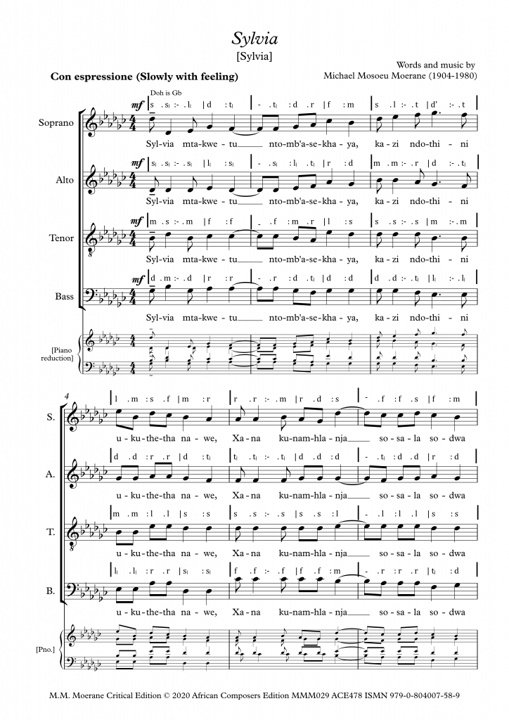 Unlike Moerane’s other love songs inspired by the poets he set, Sylvia is not about a fictional subject. Sylvia Ntombentsha Zongola was a real person. She was a student at Mfundisweni Teacher Training Institute in Pondoland, near the south-eastern seaboard of South Africa, a college of education where Moerane taught in the late 1950s. The song, Sylvia may have been written when she graduated, and the lyrics suggest that this is when they parted. For some years afterwards, however, they saw each other, because she lived just across the border in South Africa from where Moerane worked in Lesotho. The melodic and harmonic writing is almost Mahlerian – the opening phrase is reminiscent of one of Mahler’s Rückert Lieder. The middle section provides light-hearted relief with its ragtime style, but the overwhelming emotion is one of profound longing. Several very different renditions are available on Youtube including the one below, by the Glorious Sound choir, made in May 2021.