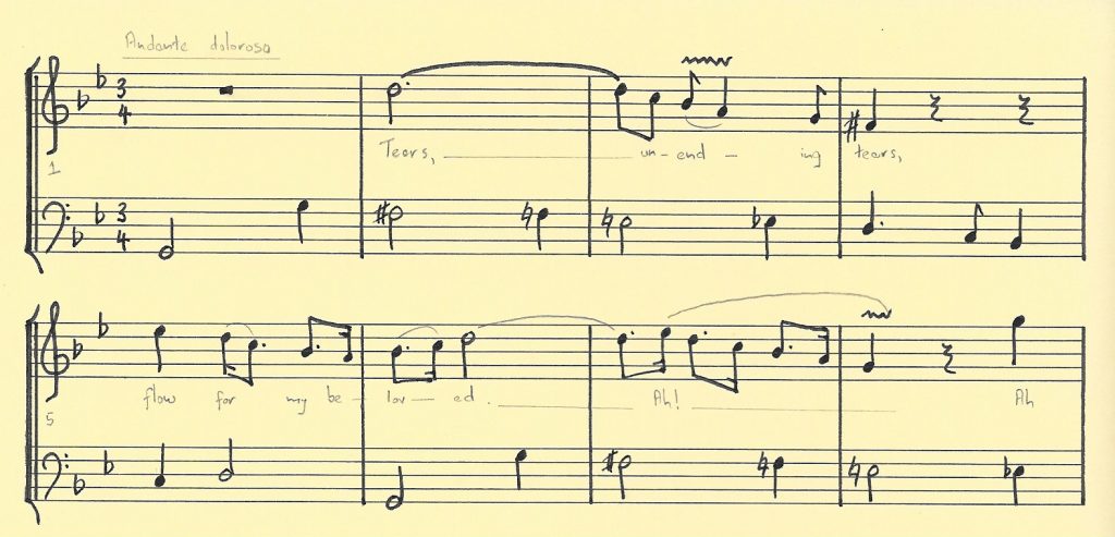 The only surviving manuscript of tears, unending tears for solo voice and piano, is a fair copy. On the cover page Reddy called it ‘Song on a Ground Bass in the Baroque style’. It is undated but may have been written in 1983, the same year as his setting of Shakespeare’s tell me where is fancy bred, which is not dissimilar in style. The scoring of tears is unspecified. It is written on two staves – melody and bass – and although the bass is not figured, all the ornaments are indicated. The words are by Reddy, and obviously inspired by John Dowland’s famous ayre of 1600, ‘Flow my tears’, in turn derived from Dowland’s instrumental ‘Lachrimae pavane’. The reason for Reddy writing the piece, or details of any performance of it, are not known.