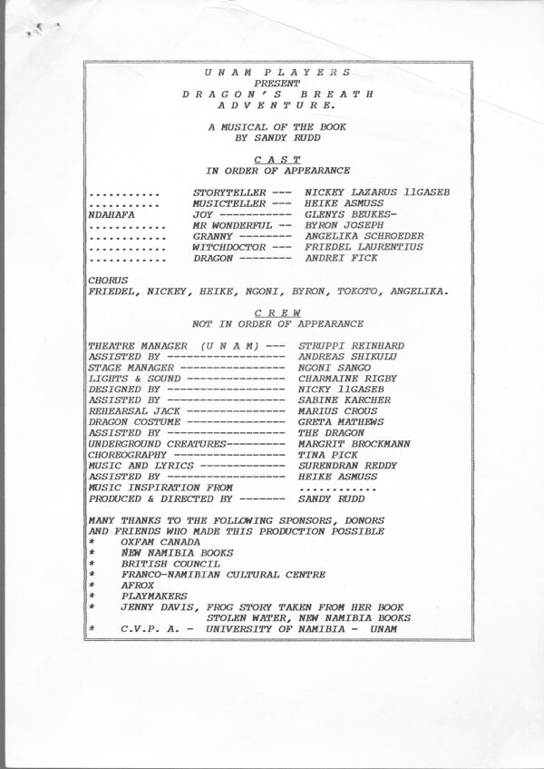 This children’s musical theatre work in 14 sections was first performed as Dragon’s Breath Adventure in 1994, at the National Arts Festival in Grahamstown, South Africa. It is based on a book by Sandy Rudd with lyrics and music by Reddy, and was premiered at the Festival by the UNAM Players, comprising students and staff from the University of Namibia, Windhoek. Reddy was a lecturer in music there between 1992 and 1994 and also taught at the Windhoek Conservatoire. There is no score since Reddy composed the music directly on his Yamaha QX3 sequencer, but there is a libretto of Dragon’s Breath Adventure showing Reddy’s annotations (the first page of which is shown on the right and which is a free download here). The programme for the first performance and MIDI recordings of all 14 sections are given below. The music draws freely on nyamaropa, a well-known mbira tune from Zimbabwe, Reddy’s country of birth, as transcribed by the great expert on Zimbabwean music, ethnomusicologist Andrew Tracey. It also draws on a genre of popular South African music called mbaqanga.