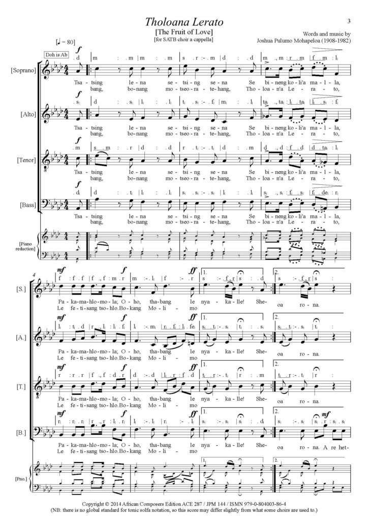‘Tholoana Lerato’ seems to have been written in the last years of Mohapeloa’s life c.1979, but the manuscript was found only in 2007. The song celebrates the founding of Manyatseng orphanage by missionaries from the Paris Evangelical Missionary Society, the first mission in Lesotho (1833). In vivid detail, through his longest song text, Mohapeloa equates the struggle to achieve Lesotho’s social development with the history of the church in Lesotho.