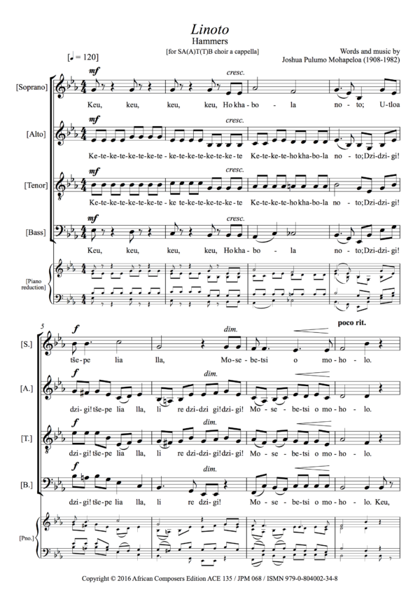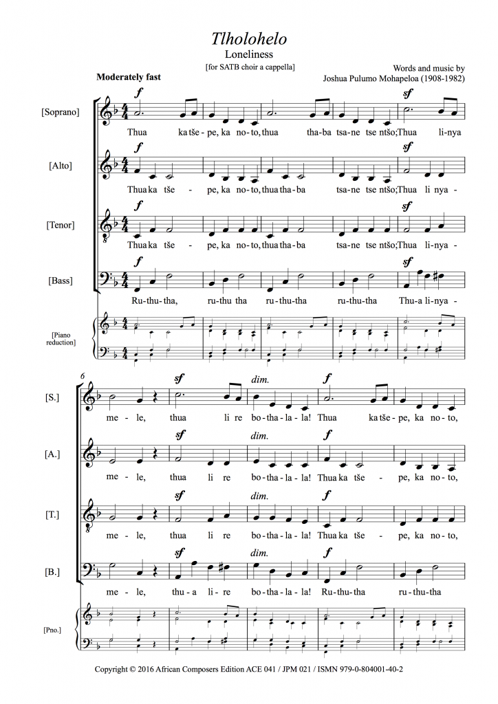 Mohapeloa wrote ‘Thlolohelo’ ((Loneliness) in the early 1930s, publishing it in Morija as song No. 21 of 32 in his first song collection, Meloli le Lithallere tsa Afrika. Loneliness of separation from their families was a common experience of Basotho migrant workers, who left Lesotho annually to work on the mines of the Witwatersrand – the ‘black mountains’. The translation below is by Mohapeloa, found among his correspondence with Yvonne Huskisson at the SABC (Johannesburg) from the mid-1960s. He also left a version of the Sesotho lyrics for this song, which differ slightly from the original sources and the 1965 manuscript in that the words ‘Ruthutha lithaba’ (Crush the mountains) in line 4 are missing. (The Bass at this point sings ‘Rrrruthutha’, the rolled ‘r’ suggesting loud noise.)