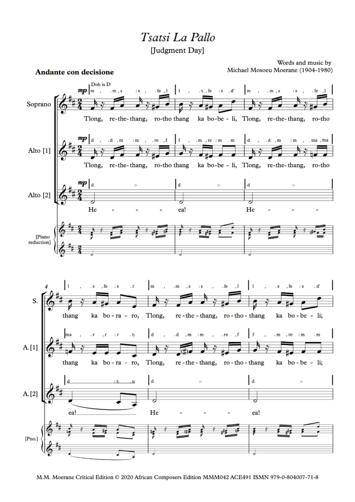 This song for three female voices about judgment day is somewhat ambivalent: we are not sure if this is the ‘Day of Judgment’ in the Christian sense, nor do we know if it is to be welcomed or feared. The reason is that Tsatsi La Pallo is jaunty and jovial throughout, dominated by a rhythmic figure that seems to be trying to dispel any sense of disquiet while the lyrics refer to drumming and ‘beating in twos and threes’; this might even be a reference to African rhythm. Rhythm prevents doubt building up, in any case; but somehow below the surface, uncertainty remains. Like all of Moerane’s songs for Soprano and two Altos, this one is ingenious in its handling of harmony, counterpoint, and phrasing. In order to help choirs learn this song, a free mp3 of the lyrics spoken by Mpho Ndebele is downloadable when the song is purchased along with a rehearsal mp3 of the song at a slow tempo.